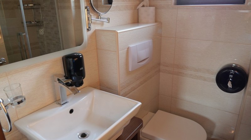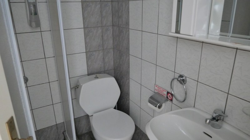 V nacionalnem parku Plitvička jezera sva se odločila za nočitev v starem in dotrajanem hotelu Bellevue, ki pa ima res dobro izhodišče in svoje parkirišče. Soba je bila res majhna in s starim pohištvom. Kopalnica še manjša in še starejša. Pač verjetno 40 let vse skupaj staro, a lokacija je zmagala. Zjutraj sva lahko šla z zajtrka naravnost v park. Zajtrk je bil dober.