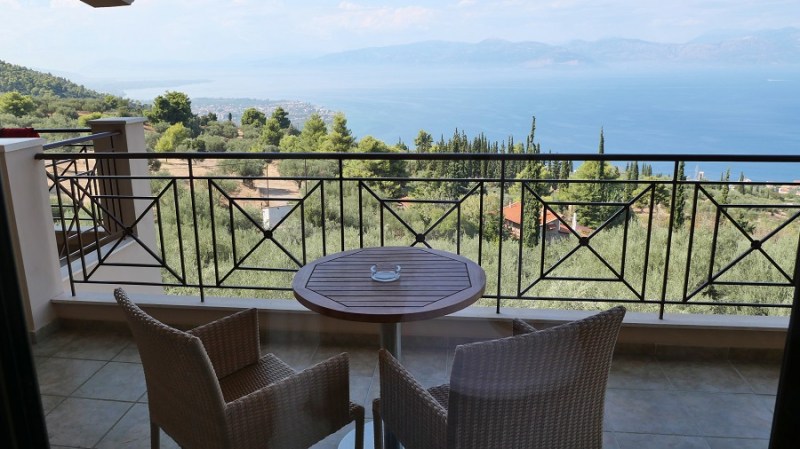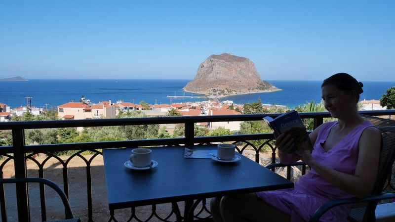 V Monemvasii sva si izbrala hotel s pogledom na otok z najine terase in sicer z razlogom. Villa Cazala se nahaja na vrhu hriba, praktično je zadnja hiša v vrsti in vse sobe imajo balkon s pogledom na otok. Resnično lepo in vredno vsakega denarja. Soba je lepa, velika, kopalnica tudi, najlepši pa je zagotovo pogled s terase. Spala sva odlično, zjutraj odgrnila zaveso in zagledala enega najlepših prizorov v najinem življenju. Prečudovito.