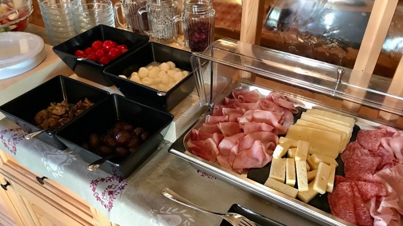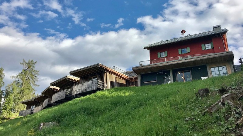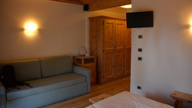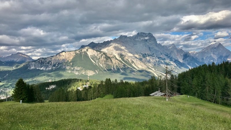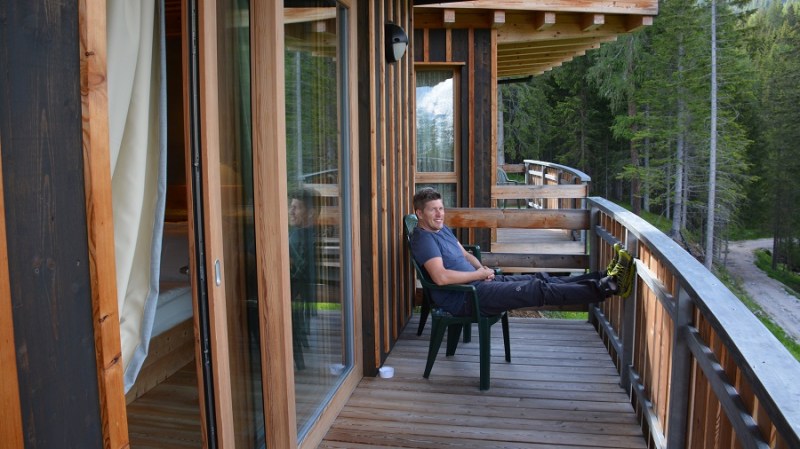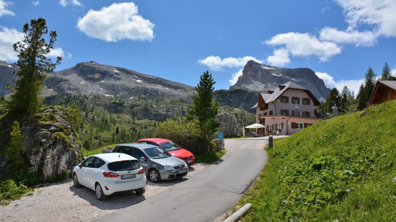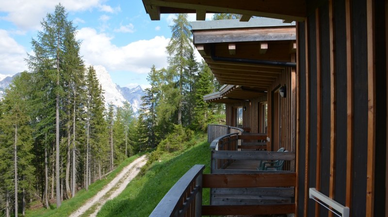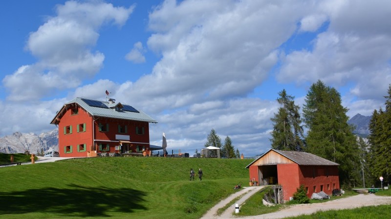 Prvo noč sva prespala blizu Cortine na prelazu Falzarego v koči La Locanda Del Cantoniere. To je bila in je še očitno gorska koča, a so ji prizidali še 5 novih prekrasnih sob s čudovitim razgledom. Ne morem prehvaliti lokacije in izjemnega zajtrka. Soba popolnoma nova v lesu in s čudovito teraso. Večerjala sicer nisva pri njih, ker nisva bila lačna, a tudi jedilnik je bil izjemen. Skratka hotel lahko priporočim tudi najzahtevnejšim gostom. Od tukaj sva se proti večeru sprehodila še do smučišča, od koder je lep razgled na Cortino.