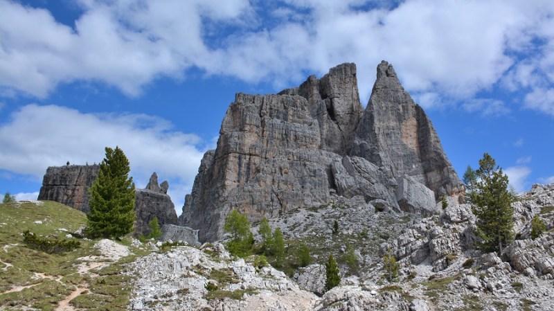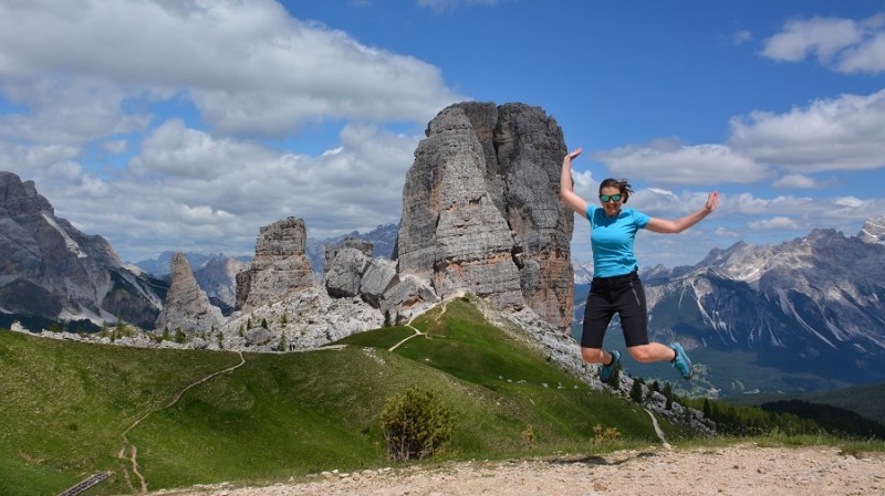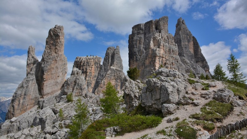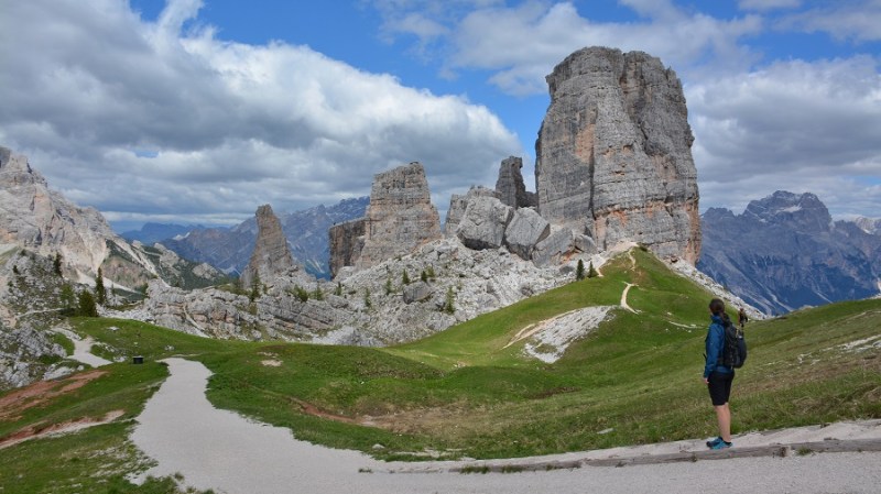 Znameniti osameli stolpi Cinque Torri se nahajajo zelo blizu Cortine di Ampezzo. Do njih sta dve izhodišči s prelaza Falzarego. Ker sva bila v tem delu Dolomitov prvič, sva midva najprej poizkusila z vožnjo do koče Rifugio 5 Torri (2.137 m). Ne boste verjeli, a asfaltna cesta vas pripelje do koče. Cesta je sicer ozka za en avto, a ker ni bilo tokrat nobene gneče, je bilo zelo preprosto. Parkirišč je za ducat avtomobilov, a v poletni in običajni gneži zagotovo premalo. Drugo izhodišče pa je prav tako na prelazu Falzarego malce naprej in sicer s sedežnico. Le ta vas pripelje do koče Scoilattoli. Vrhunsko! S parkirišča sva midva hodila v smeri urinega kazalca kar po makadamski cesti 15 minut do koče Scoilattoli (2.255 m). Ves čas vas spremljajo čudoviti razgledi na sosednje vrhove, med katerimi seveda kraljujejo Tofana di Rozes, Cima Bos in Lagazuoi Piccolo ter na drugo stran Nuvolau, Averau in druge vršace.