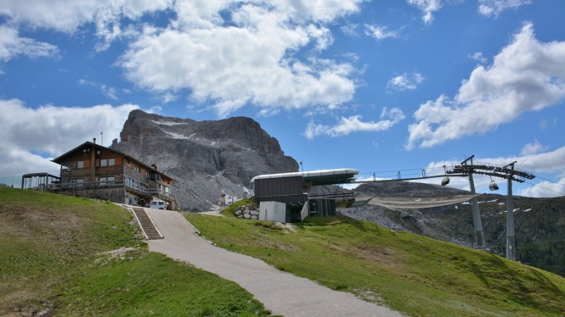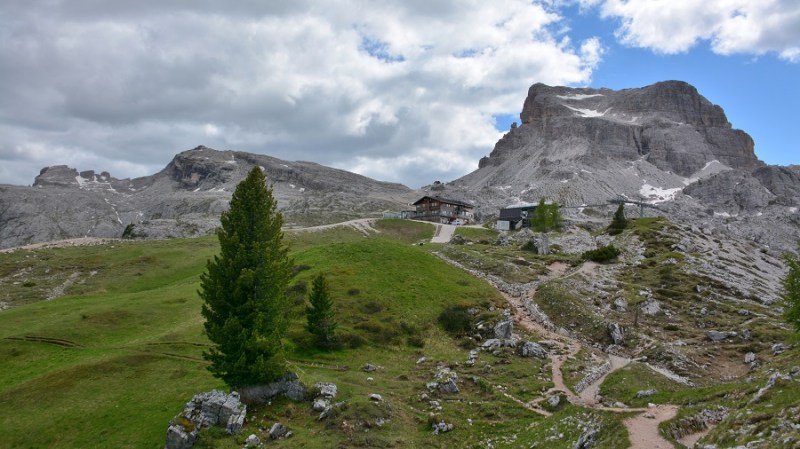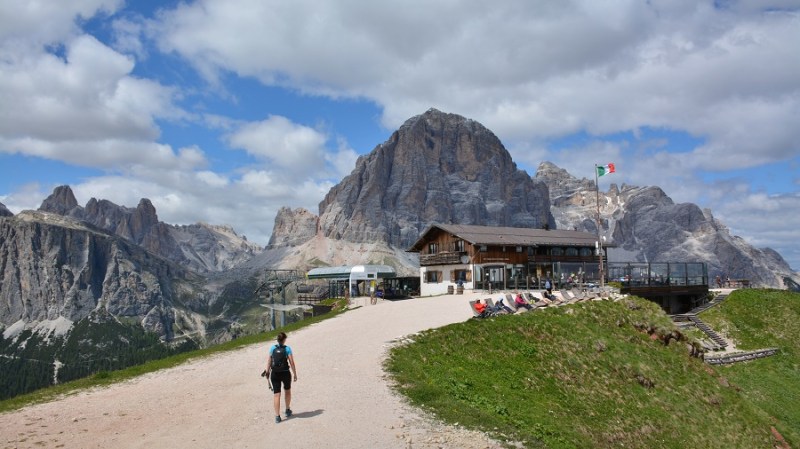 Midva sva imela v načrtu sicer popoldanski vzpon na Nuvelau (2.575 m), a je bil vrh oblačen in zelo vetroven, zato sva se odločila, da narediva samo postanek za kosilo v koči in nato krožno pot okoli osamelcev. Koča je na fantastični lokaciji. Do tukaj se tudi pripeljete s sedežnico s prelaza Falzarego. Uau, Tofana pred nosom in razgledi v vse smeri neba. Človek ne bi nikoli odšel od tukaj. Jedilnik naju je sezul. V kočah kuhajo bolje kot v vsaki naši gostilni. Domače testenine in njoki, narezki z italijanskimi dobrotami… njami. Izjemno kosilo za zelo normalno ceno. In kako dobro. Za prste obliznit.
