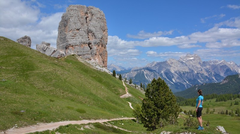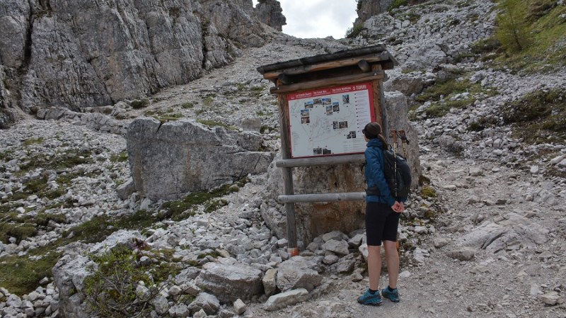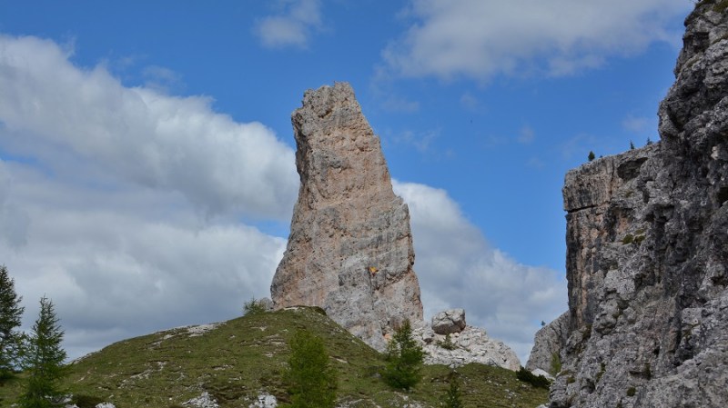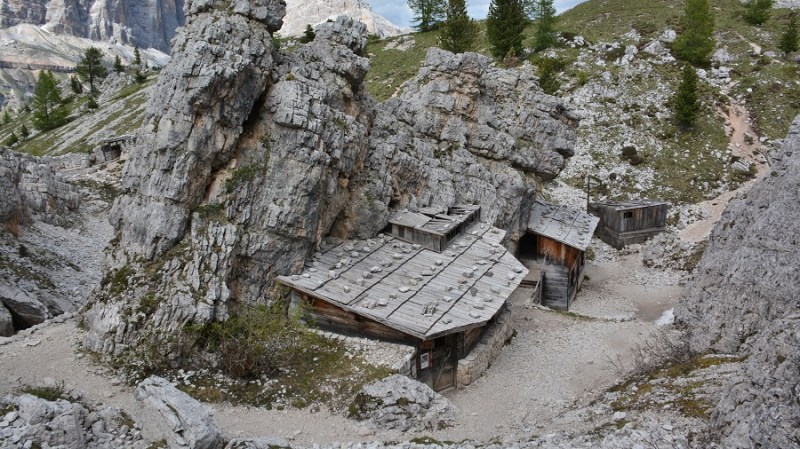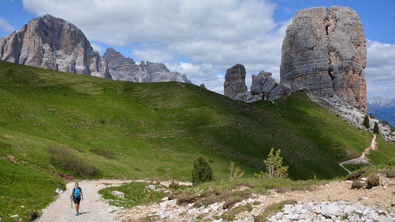 Od koče se potem odpravite naokoli znamenitih 5 prstov. Držite se leve poti in se ne boste nikakor izgubili. Ker je tukaj potekala prva svetovna vojna, si na krožni poti lahko ogledate tudi ostanke bunkerjev in zatočišč (kavern). Sicer pa lepi razgledi na 5 stolpov (eden se je porušil leta 2004), sosednje vrhove in na Cortino di Ampezzo. Cinque Torri so seveda zelo priljubljeni pri plezalcih in tudi midva sva enega ujela visoko v steni. Nazaj pridete ponovno pri koči 5 Torri, kjer ste parkirali avtomobil.