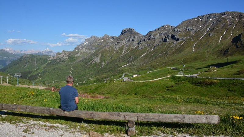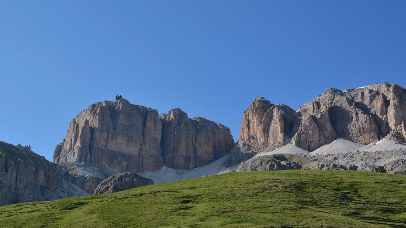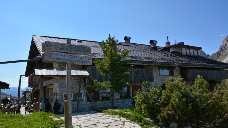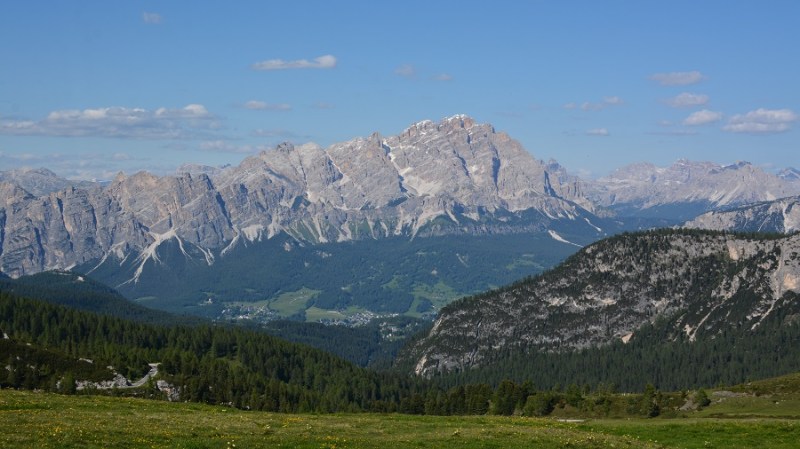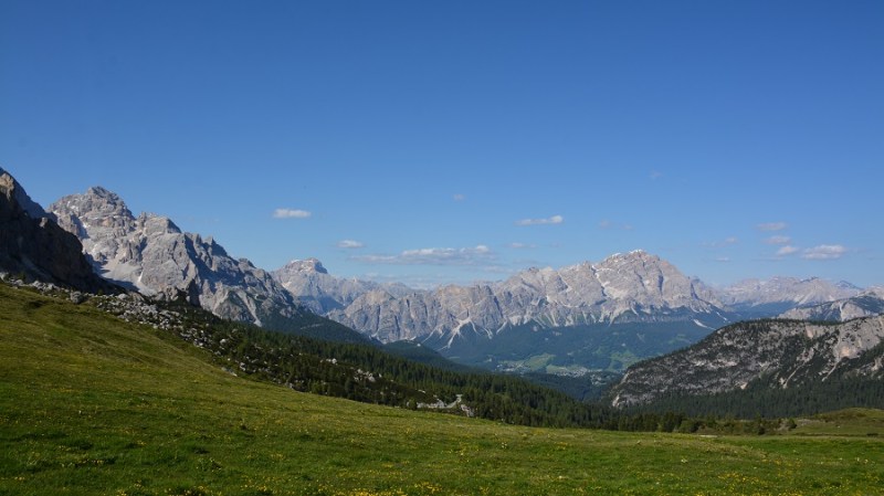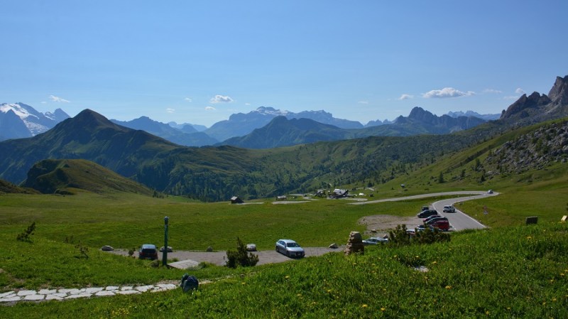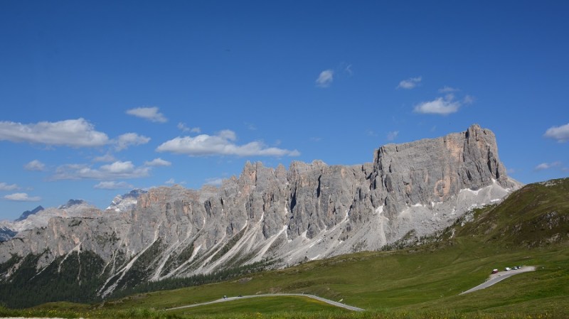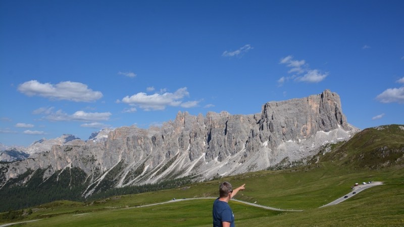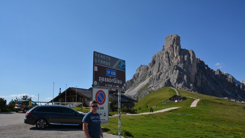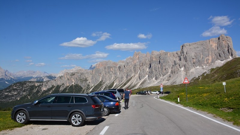 Prvi postanek sva imela na vrhu prelaza Giau, od koder so prekrasni razgledi na vse strani neba. Na vrhu je tudi koča z dobro ponudbo hrane in pijače. Na Passo Giau je najbolj znameniti pogled seveda na južno stran gore Nuvolau. Malce sva se sprehodila, sicer pa občudovala rumene travnike, zelena pobočja in čudovite vrhove. Dolomiti so res posebni v vseh pogledih. Še posebej pa v lepem vremenu, ki nama je res služilo.