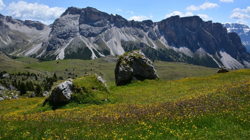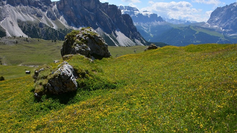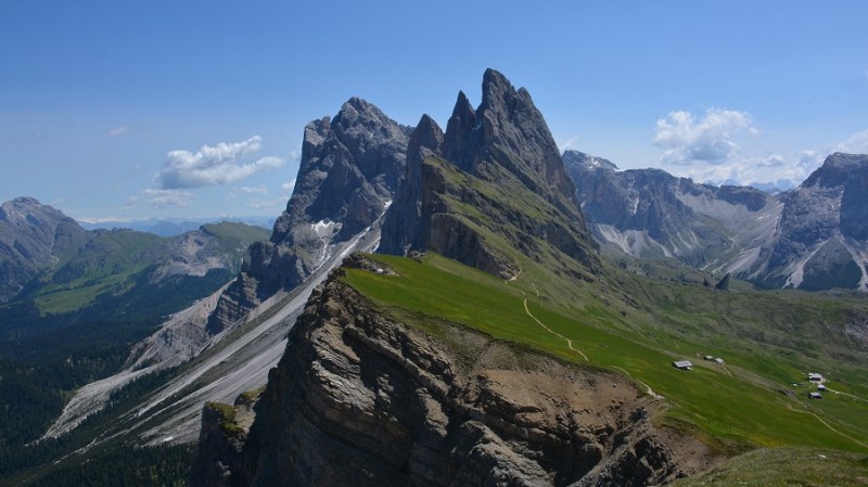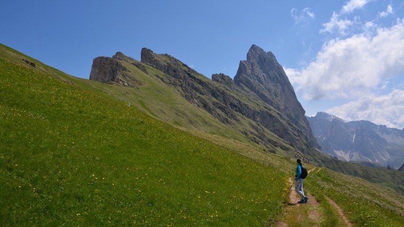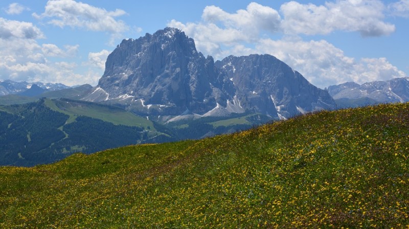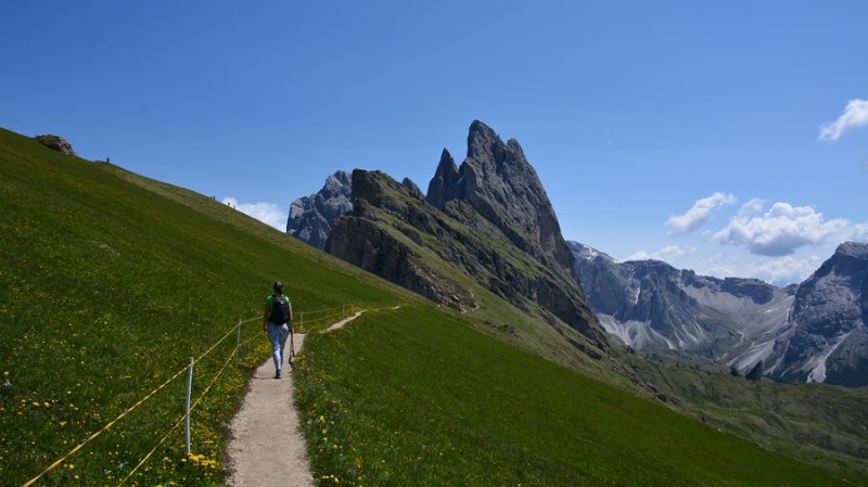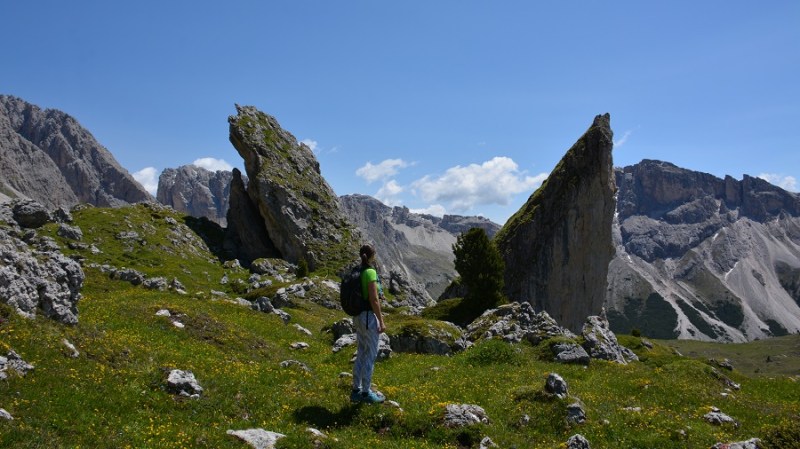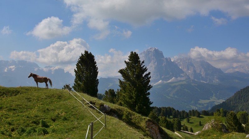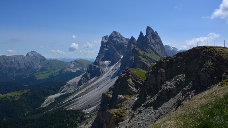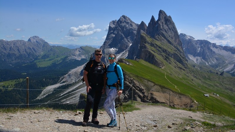 Kljub dotrajani postelji sva izjemno dobro spala in zjutraj naju je pričakal v jedilnici odličen zajtrk, ob katerem sva hitro pozabila na slabo kakovost nastanitve. Vse je bilo hitro poplačano. Zunaj je bilo precej oblačno in megle so se vlekle čisto po dolini. Gledala sva vremensko napoved in se odločala, kako bova preživela dan. Jaz sem močno stiskala pesti za še en prečudovit sončen in jasen dan visoko v gorah. Odpeljala sva se do gondole Col Raiser v Val Gardeni in še vedno čakala, da se vsaj malce razjasni. In sva dočakala. Skok na gondolo, ki prihrani kar 600 m višinske razlike, nato pa urno pot pod noge do vrha Secede (2.519 m). Do vrha je dodatnih 580 višincev in dobro uro hoje. Ves čas vas spremlja krasen razgled na vse strani neba, ker hodite po travniških pobočjih. Na vrhu pa prekrasen razgled daleč v avstrijsko gorovje in seveda na špičake Mittag-Scharte, Fermede, Odlo in najvišji Sass Rigais. Vrnila sva se po krožni poti mimo še dveh špičastih skal Pieralongia in po cvetočih travnikih nazaj do zgornje postaje gondole. Prečudovit dan!