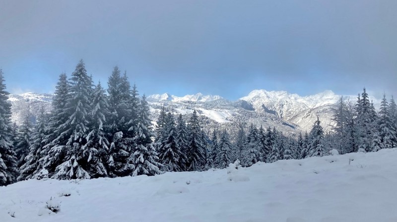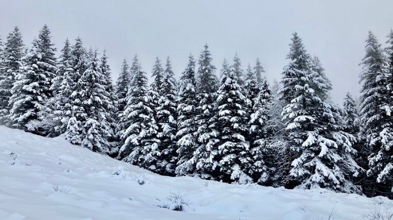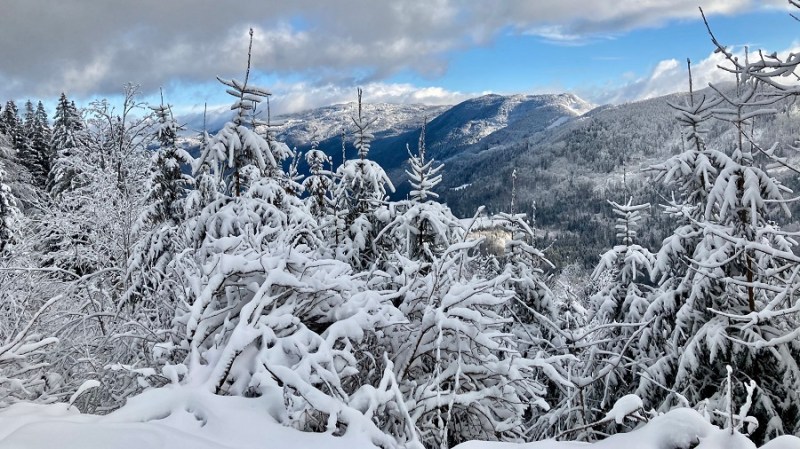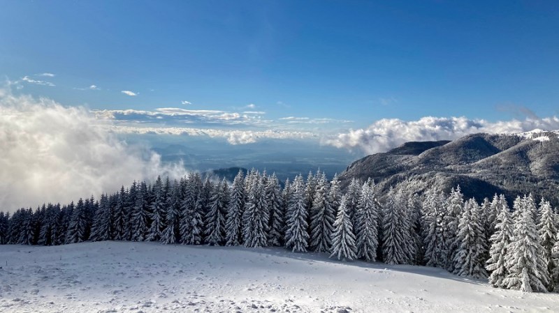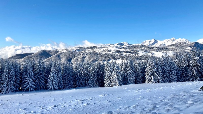 Zimska idila s svežo snežno odejo naju je ponovno zvabila v hribe. Malo sva bila vseeno pozna, a vseeno sva ujela še pravi trenutek, da sva na Črnivcu (ob nenavadnem navalu drugih regijskih obiskovalcev) sploh dobila parkirni prostor. Odprte občine, zaprte regije so privedle mnoge v naše konce. Urno sva jo mahnila proti cilju – tokrat sva si izbrala Kranjsko reber (1.435 m), kjer še pravzaprav čisto nikoli nisva bila. Idilična snežna pokrajina naju je spremljala vso pot skozi gozd do poseke. Ker sva šla po gozdu, kjer je tudi prava markirana planinska pot, in ne po makadamski cesti (kjer so hodili sankači), sva imela praktično popoln mir do vrha. Za jutranje sva bila pozna, za popoldanske pa prehitra. Ravno prav! Na vrhu se odpre čudovit pogled – na Štajerski strani je bila gosta megla in nobenega razgleda, na Kamniško stran pa sonce in brez oblačka, tako da so bili prečudoviti razgledi na celotno verigo Kamniško-Savinjskih Alp in Malo ter Veliko planino. Na vrhu je noro pihalo, tako da sva postanek z malico in toplim čajem naredila nekaj korakov pod vrhom v zavetju. Prava zimska pravljica naju je ponovno spremljala nazaj do izhodišča. Prekrasen dan in zagotovo se vrneva zelo kmalu!