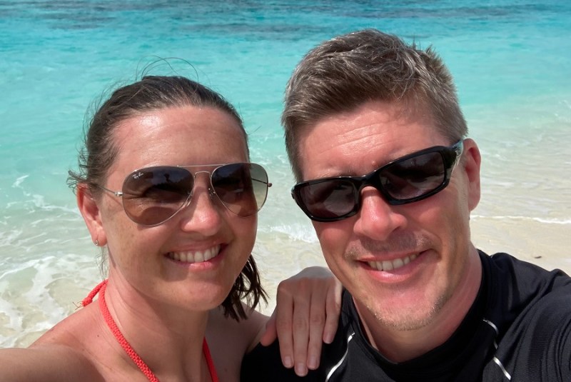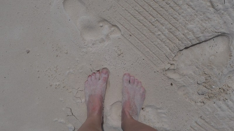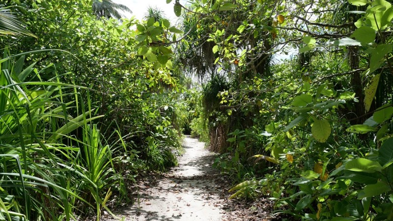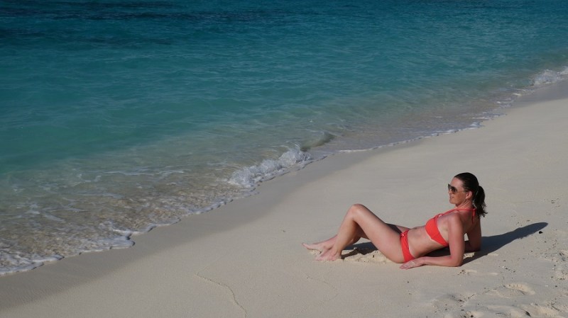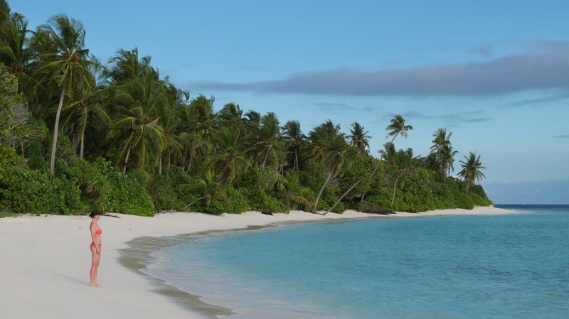 Vse dni sva preživela na najini plaži. Sama. Bikini plaža se nahaja na zahodnem delu otoka. Do nje sva hodila približno 10 minut od najine nastanitve. Zadnji del tudi skozi tropski gozd. Na plaži so ležalniki in senčniki, ki jih lahko poljubno uporablja kdorkoli. Plaža je dolga okrog 500 m na sever in potem še 500 metrov na jug, kjer so čudovite palme. Morje je prekrasno – popolnoma čisto, toplo (30+ stopinj) in neverjetno turkizne barve. Plaža je prav tako popolnoma čista, tu in tam priplava kakšna plastenka, ampak res noro čisto. Pesek je drobno mlet, bele barve in res popoln. Vreme sva imela lepo z več in manj oblaki. Oblake jaz zelo pozdravljam, ker vsaj malo zadržijo sončne žarke. V tem delu je močan tok, zato je potrebno biti previden priplavanju izven otoškega koralnega grebena. Otok ima čudovit koralni greben, a morate vseeno biti previdni s tokom. Jaz nisem snorklala na tem otoku, ker sem si želela neskončno veliko plavanja po več mesecih. Plaža je obrnjena na zahod, zato lahko zvečer opazujete neverjetno lepe sončne zahode.