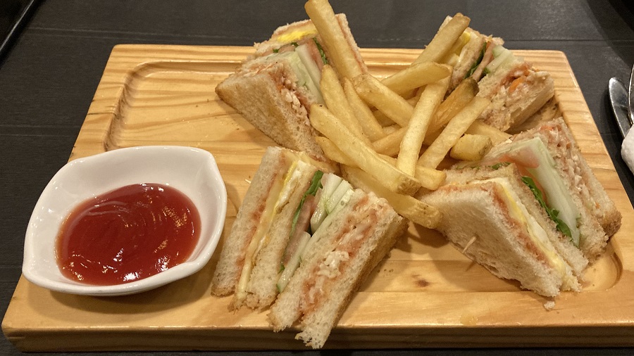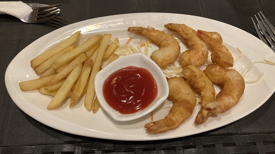 - mango juice 2x, club sendvič, škampi = 385 MVR (22,1 EUR)