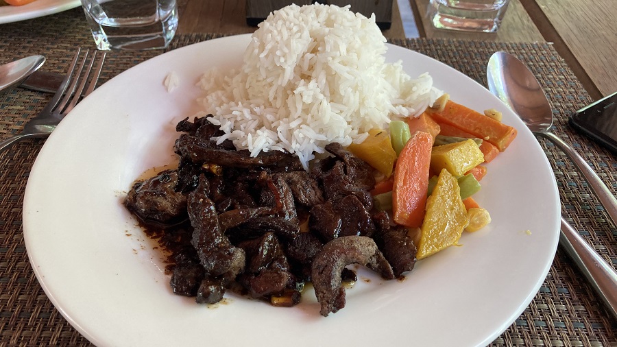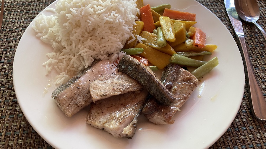 - kosilo riba z zelenjavo, goveji trakci, voda = 330 MVR (19 EUR)