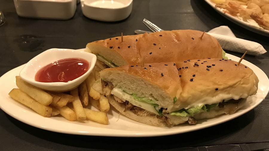 - mango juice 2x, sendvič, škampi, voda, brownie = 29 USD (24,6 EUR)