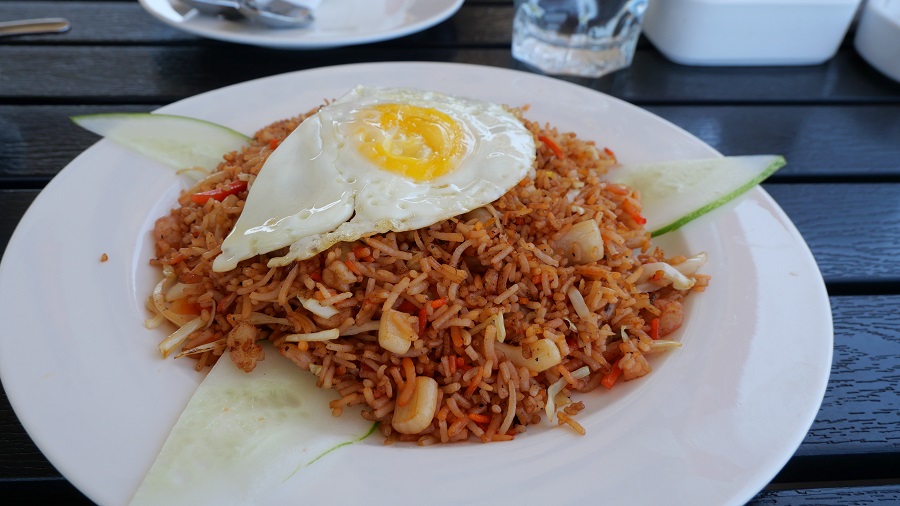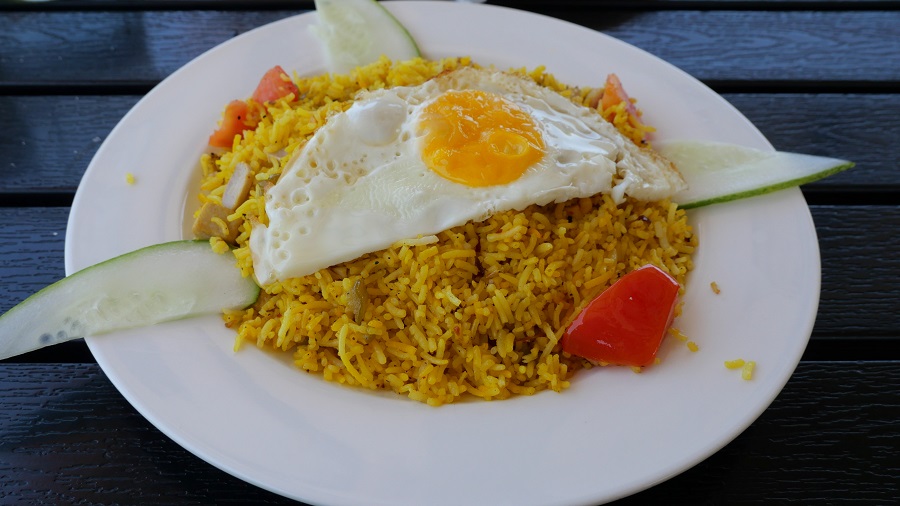 - kosilo nasi goreng, riž s škampi, voda, kava, čaj = 370 MVR (18,4 EUR)