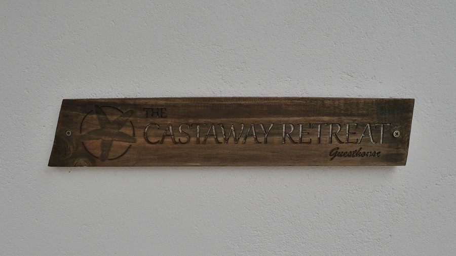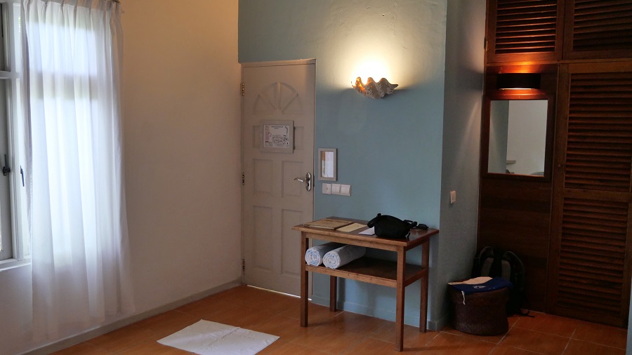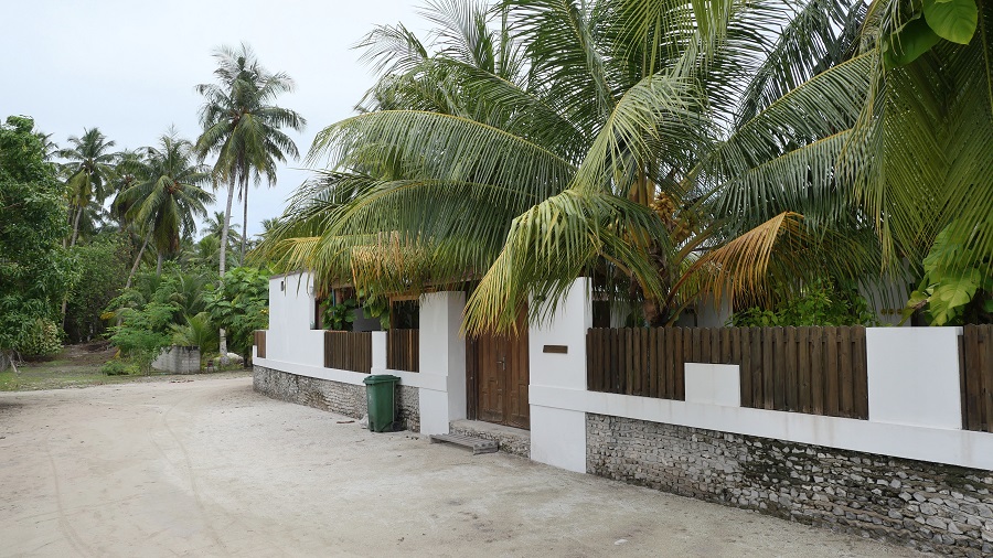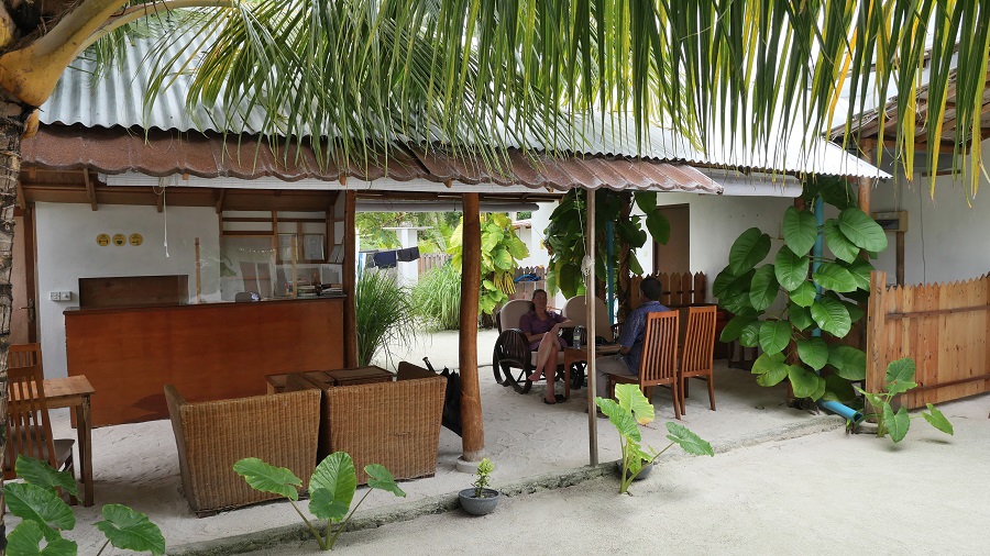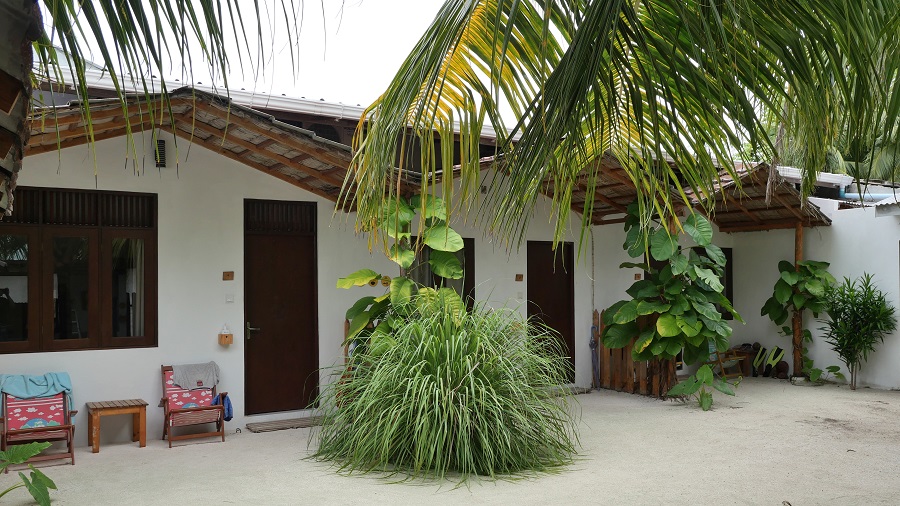 Na otoku je samo 5 guesthousov, ki spejemajo turiste. Midva sva naredila rezervacijo na Bookingu nekaj dni prej. Kot vedno seveda vse drži. Obvezno si naredite prej rezervacijo, zato da vam oni uredijo prevoz s hitrim čolnom do tukaj, ker ga v osnovni ponudbi hitrih čolnov ni. To se dogovorite z lastnikom čez Booking ob rezervaciji. The Castaway Retreat je nastanitev s tremi zvezdicami, tako kot je to na Maldivih običajna praksa. Lastnik ima 4 sobe s kopalnicami in dvorišče. Soba je velika, osnovno opremljena, z odlično trdo posteljo in zelo čisto posteljnino. Kopalnice so povsod zunanje, torej tuširanje pod zvezdnatim nebom in zelo lepo opremljene ter brez tople vode, ki je tudi ne potrebujete. Za nočitev z zajtrkom sva plačala 47,5 EUR, kar je res smešna cena. Na celem otoku smo vseh 5 dni bivali le 4 turisti, midva in dva Nemca. Vsi smo bili v tej nastanitvi, vse ostalo je bilo zaprto. Raj na zemlji za ljubitelje miru. Lokacija seveda izredno mirna, je pa bilo do plaže 10 minut hoje. Midva sva bila zelo zadovoljna, je pa seveda to osnovna nastanitev, ki nama več kot zadošča. Pri njemu si si lahko izposodil tudi opremo za snorklanje in organiziral je izlete na naše želje. Vsak dan nama je prinesel tudi svež kokosov oreh.