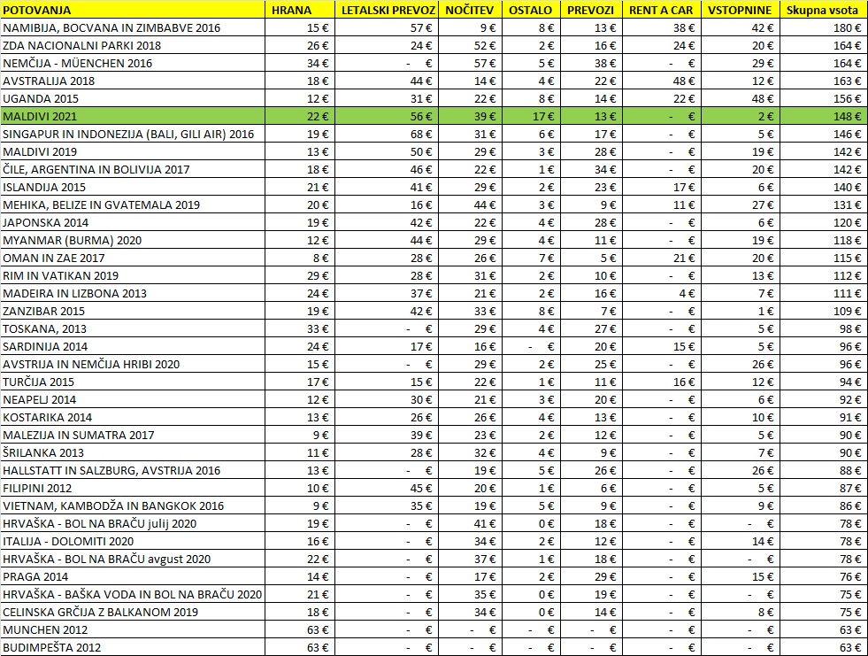 Na najinem 13-dnevnem potovanju sva zapravila na dan v povprečju 148 EUR na osebo, kar pomeni ne najdražje in tudi ne najcenejše potovanje. Zlata sredina po porabi na dan na osebo, seveda pa je k temu botrovala najbolj cena letalske vozovnice in 2-dnevnega bivanja v resortu. Glede na to, da res nisva nikoli gledala na cene hrane, je bila le-ta na celotnem potovanju res poceni. Porabila sva 22 EUR/osebo na dan, kar je res malo. Letalske karte sva kupila po dokaj visoki ceni iz Ljubljane, a s super povezavo in kratkim postankom v Istanbulu. Za nočitve sva odštela še vedno normalno ceno, čeprav sva si tudi tokrat privoščila zelo lepe in dražje nastanitve na otokih. In seveda 2 dni po dokaj zasoljeni ceni v resortu. Najina povprečna cena nočitve z zajtrkom je namreč bila 92 EUR. Tudi za čolne med otoki sva tokrat plačala povsem normalno cene. Za vstopnine nisva porabila veliko, ker sem šla samo jaz enkrat snorklati z mantami.
