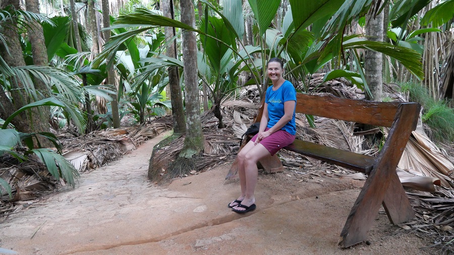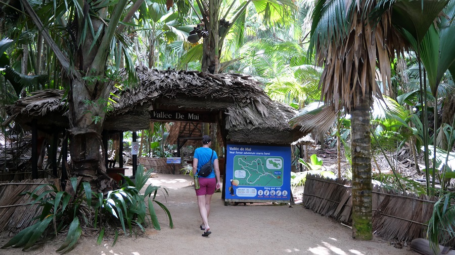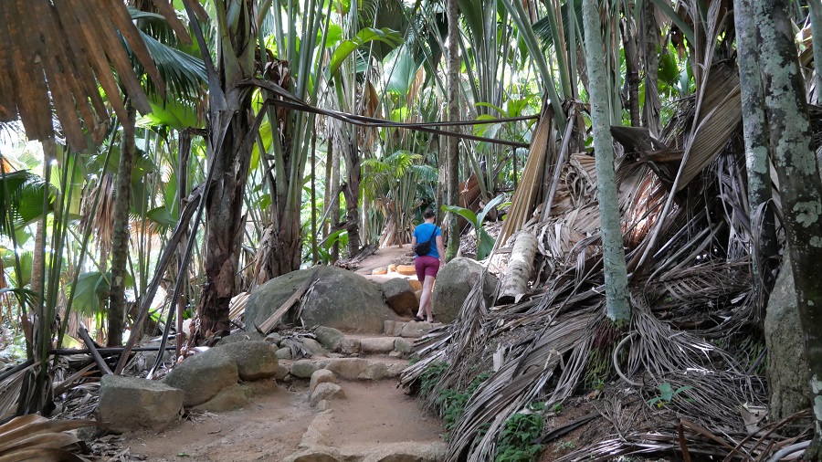 Na poti nazaj do najinega apartmaja sva se ustavila in si ogledala naravni rezervat Vallee de Mai, ki je tudi pod Unescovo zaščito. V naravnem rezervatu si lahko ogledate zelo dobro ohranjen prvotni gozd posebne endemične vrste palm, ki se imenujejo Coco de Mer. Zelo visoke palme so lahko moškega ali ženskega spola, obe vrsti pa imajo zelo velike plodove. Drevo ima največ semen katerekoli rastline na svetu. Ženski plodovi so tudi zelo težki – komaj sem ga dvignila. V gozdu živijo tudi mnoge živali – ptiči, plazilci, redka sejšelska črna papiga, raki in polži. Po naravnem rezervatu se sprehodite po treh različno dolgih poteh. Midva sva izbrala srednjo pot in si park ogledala v slabi uri.
