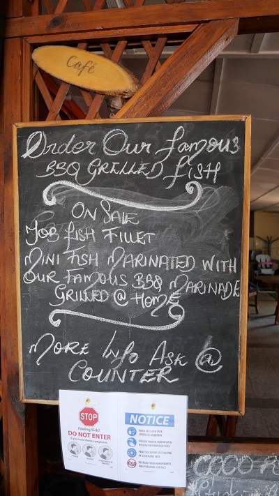 Na poti proti apartmaju sva se ustavila še v eni od mnogih Take Away restavracij na otoku. Restavracije so namenjene domačinom, a tudi turisti se jih dodobra poslužujejo, ker so poceni in priročne. Ustavila sva se sicer še v eni prej, pa nič ni izgledalo obetavno in tudi vse so že prodali. Naslednji postanek je bil v CoCo Rouge, kjer je bilo precej “lepše” in tudi ponudba precej boljša. Ker je covid, nisva smela jesti pri njih, ampak sva morala vzeti za s seboj. Vzela sva fish curry in je bil korekten. Kupila pa sva še bananino pecivo, pa kokosovo pecivo in torto ter mangov smoothie. Bilo je vse odlično. Je pa res, da se midva rada posediva v restavraciji in pojeva, zato nama ta “take away” opcija ni najbolj dišala. Sicer pa poceni in korektno.