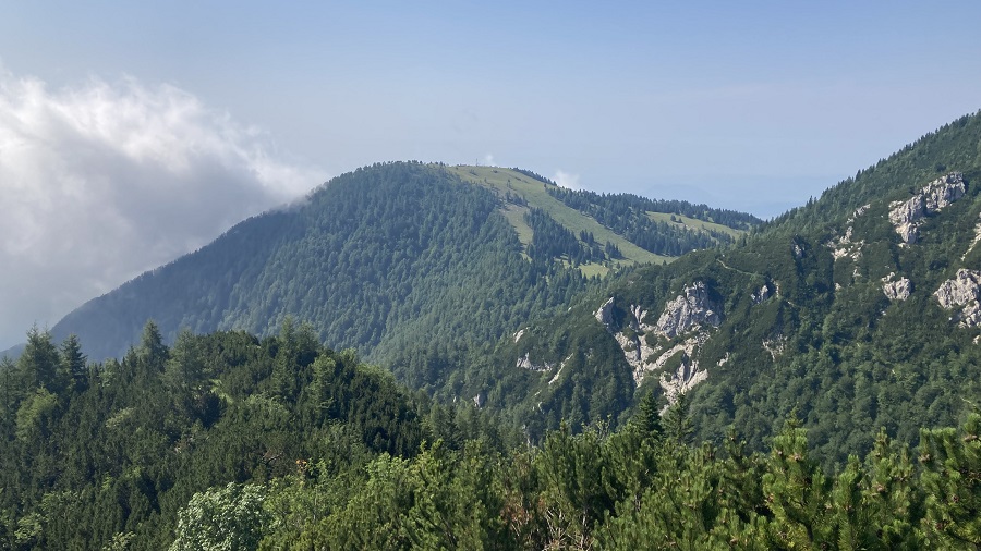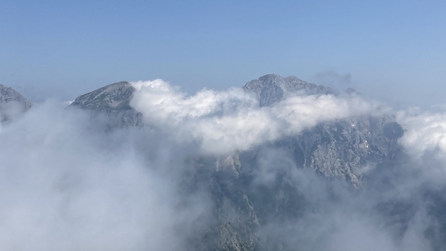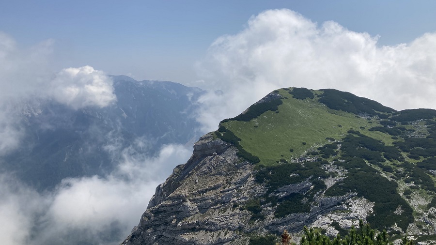 Kmalu je oblake prineslo iz Kamniške Bistrice proti vrhovom, midva pa sva se odločila za krožno pot proti Zvohu (1.971 m). Le-ta poteka po grebenu in na dveh mestih je nekaj precej zahtevnih zajl in malo za poprijeti. Nič hudega, a vseeno raje opozorim. Na Zvohu sva imela gosto meglo brez razgleda. Nama je zelo ustrezalo, saj je bilo sicer res peklensko vroče in sonce je bilo zelo močno.