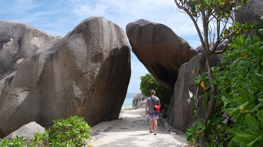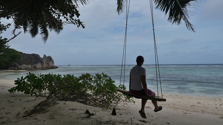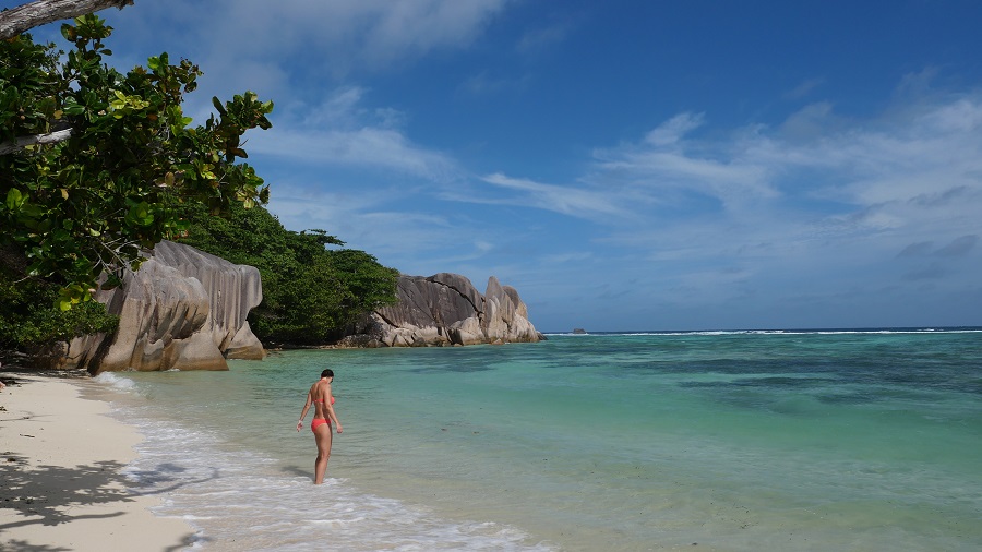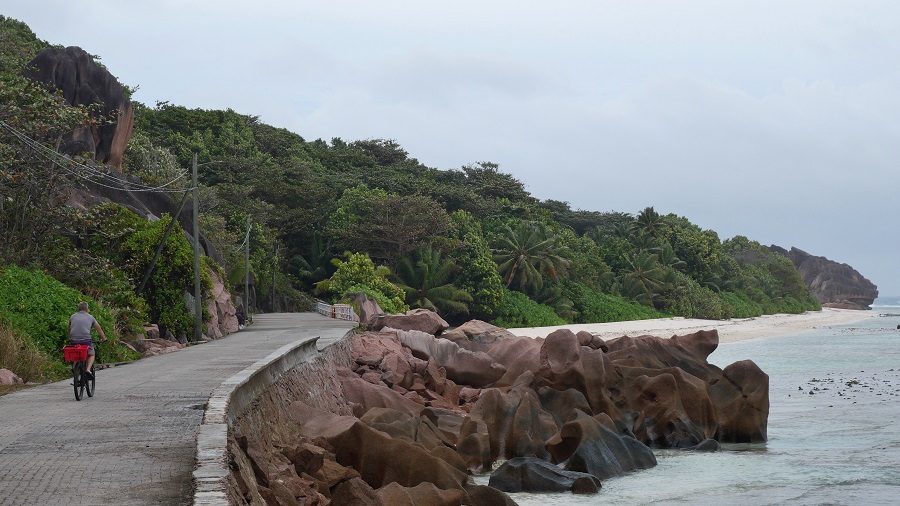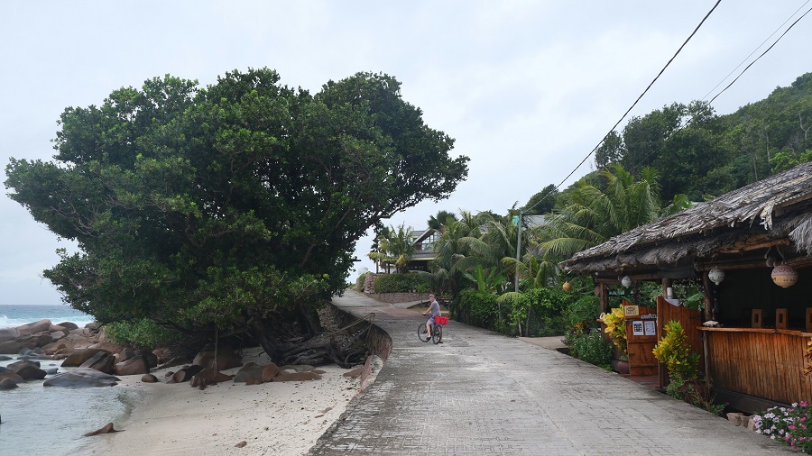 Na otoku La Digue je precej sproščeno vzdušje, a pravzaprav veliko izbire vseeno ni. Obiskovanje plaž, kopanje ali kolesarjenje po otoku. Ker je bilo prvih nekaj ur še oblačnih, sva se odločila za raziskovanje otoka s kolesom. Odpeljala sva se mimo plaže Severe naprej mimo res majhne lepe plaže pri hotelu Patatran, nato pa naprej po edini cesti ob plaži do zaliva Fourmis. Sejšeli so res tropski raj oziroma botanični vrt na prostem na vsakem koraku. Kar naprej sem se ustavljala s kolesom, da sem fotografirala in opazovala bujne raznovrstne cvetove. Sicer pa je ta del otoka slabo poseljen in tudi plaže je bolj kot ne že najedla plima. Za kopanje je morje neprimerno, ker je na odprto in so zelo močni tokovi. Hkrati pa so v morju še neobdelane korale, ki vas bodo močno porezale. Je bila pa vožnja do konca ceste res čudovita, zato sva jo kar ponavljala še naslednje dni za dnevno rekreacijo.