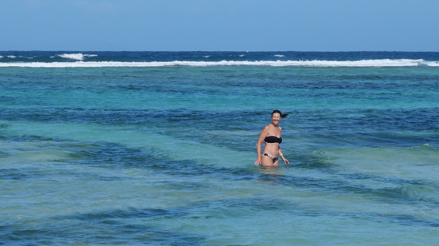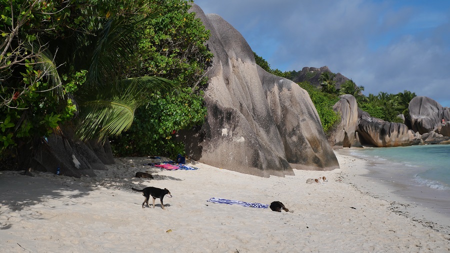 Prekrasen in sončen dan sva v celoti preživela na edinstveni plaži Anse Source d’Argent, za katero mnogi pravijo, da je ena najlepših plaž na celem svetu. Jaz bi se bolj opredelila, da je edinstvena kot pa najlepša. Razlog je seveda eden in edini – granitne skale, ki jo obdajajo in razdeljujejo na tri manjše zalive z belo drobno mleto mivko in turkiznim morjem, ki pa ga zopet razbijajo skale, ki so v vodi in tvorijo tako lepe nenavadne vzorce. Ponovno sva bila prva na plaži že okrog osmih zjutraj, se udobno namestila v senci in uživala v popolni samoti nekaj ur. Imela sva le družbo pasjih prijateljev. Obiskovalcev je bilo iz dneva v dan manj na celem otoku. Tokrat nas je bilo na celi plaži za peščico tako dopoldne kot tudi popoldne. Vmes sva skočila s kolesi k Mimi na že standardno vrhunsko kosilo in zvečer na mangov smoothie. Res prave morske počitnice v raju!