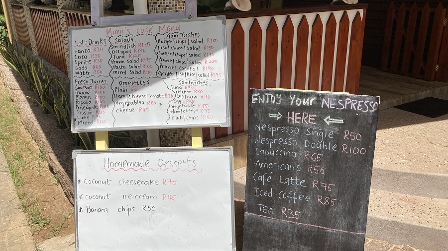 - banana cake, čoko cake, smoothie mangov = 130 SCR (6,8 EUR)