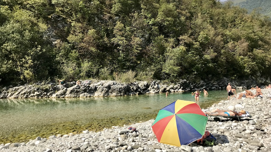 Kopala sva se v Nadiži pri vasi Robič. Parkirala sva avto na urejenem parkirišču in samo nekaj korakov vas loči do lepih tolmunčkov. Ker sva bila oba močno pregreta od hude kolesarske ture, sva se samo slekla in kar skočila v ledeno reko. Sploh nisva preverila ali se spraševala, koliko ima stopinj, kako je mrzla. Ker nama je res tako zelo ustrezalo. Prvi šok, nato pa čista uživancija v smaragdni reki. Tudi obiskovalcev je bilo malo in vzdušje izredno “fajn”. Po kopanju sva se samo par minut pogrela na soncu in se odpeljala naprej.