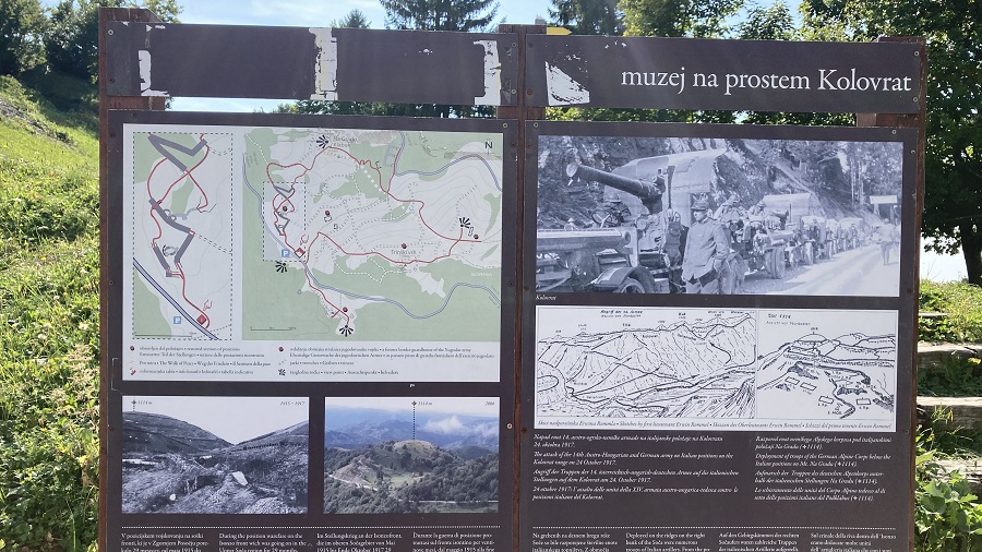Septembrska sobota brez oblaka na nebu naju je zvabila na kolo. Precej dolgo kolesarsko turo sva začela v središču Kobarida in se najprej zapeljala čez znameniti kobariški Napoleonov most. Nadaljevala sva po dokaj ravninskem delu na severni strani reke Soče mimo majhnih vasic in zaselkov do Tolmina. Nato sva zavila do vasi Volče od tam pa strmo navzgor na greben Kolovrata. Nabralo se je kar 1.300 višinskih metrov v vročini, tako da sva na vrh prišla precej izmučena. Vseskozi sva peljala po prazni asfaltirani cesti, le tu in tam je pripeljal mimo kakšen motorist. Na vrhu se odpre čudovit razgled na nekdanje bojišče soške fronte od Kanina, Krnskega pogorja do Svete Gore. Na drugo stran pa pogled čez Benečijo in Furlansko nižino seže pogled do Jadranskega morja. Zelo kmalu sva pripeljala do Muzeja na prostem Kolovrat, ki si ga sicer tokrat nisva ogledala. Med 1. svetovno vojno je italijanska vojska na Kolovratu zgradila obsežen sistem tretje obrambne črte in ta del je danes urejen v muzej. Vidite lahko poveljniška in opazovalna mesta, mitralješki in topniški položaji, kaverne ter mrežo strelskih jarkov. S kolesi sva se odpeljala naprej po grebenu do zelo znanih počitniških objektov Nebesa nad Kobaridom s prekrasnim razgledom. Sledil je samo še vratolomni spust do Kobarida. Vrnila sva se zelo utrujena, a navdušena, ker sva spet raziskala lepe kotičke naše Slovenije, ki jih še do sedaj nisva videla.