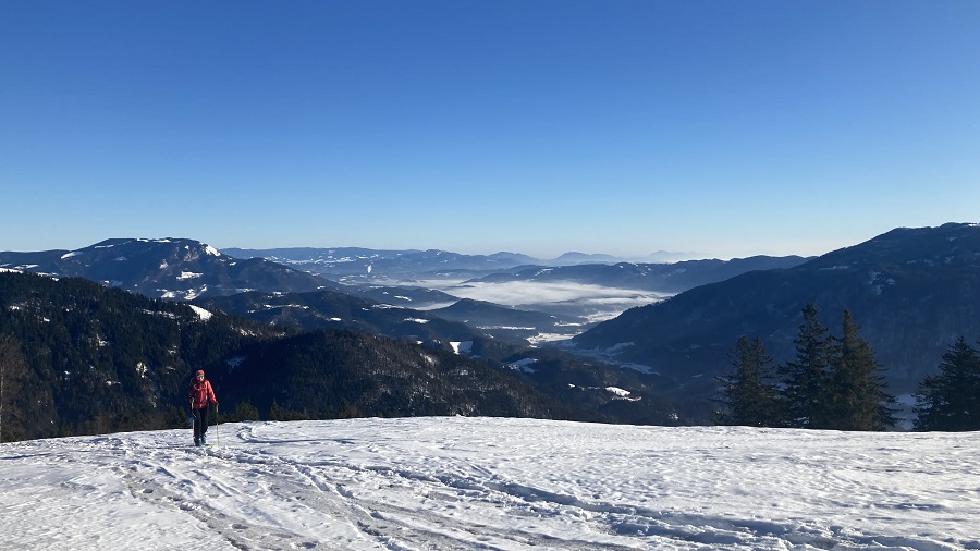 V najino paleto zimskih športov sva letos dodala še zimsko gorništvo in turno smučanje. Koronski ukrepi so naju pravzaprav že lani prisili v bolj individualne športe, letos pa se zgodba samo še stopnjuje. Tako očitno ne bo nič od najinega vsakoletnega alpskega smučanja v Avstriji. Vikend je bil kot nalašč, da preizkusiva turno smučanje. Dolgo sva izbirala hrib in na koncu izbrala Kranjsko reber (1.435 m) s Kranjskega raka. Pot dobro poznava, ker sva bila letos na vrhu že nekajkrat. Pred deveto sva začela hoditi in testirala vso novo opremo. Turno smučanje je z vidika opreme kar precej bolj zapleteno, a šlo nama je super. Že od avta sva nadela smučke s kožami in dobri dve uri brez težav hodila do vrha. Drugačni gibi telesa, a nadvse prijetni. Veliko bolj prijetni kot če gaziš s čevlji po snegu. Zgornji del je bil precej trd in leden, a je vseeno šlo res brez težav. Bilo je povsem prazno, le na vrhu je bilo nekaj pohodnikov, ki so se povzpeli na vrh s Črnivca. Topel čaj in sendvič, potem pa težji del turnega smučanja. Poledenelo pobočje, spoznavanje s povsem novimi smučmi in še močno shojena cesta so nama delali precej preglavic. A šla sva zelo počasi in varno prismučala do izhodišča.