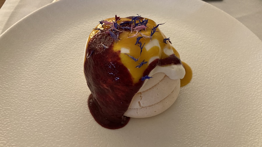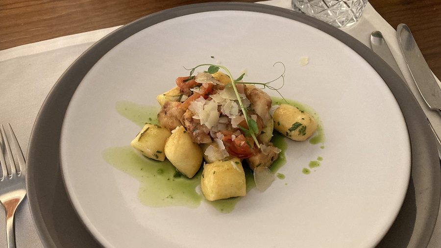 Ta naša “koronca” je prinesla tudi več domačega kuhanja za naju. Prejšnjo soboto sva vseeno ponovno obiskala nama ljubo restavracijo Brioni v Kranju. Presenetili so z odličnim jedilnikom, ki so ga očitno v zadnjih mesecih zelo dodelali in popestrili. V prekoronskem in tudi medkoronskem času sva se že dodobra navadila samo na 4 različne dnevne menuje. Kot običajno sva se tudi tokrat odločila za dnevni 4-hodni menu, ki je bil naravnost odličen. Sveže pečeno žemljico sva najprej namočila v odlično olivno olje. Želodec sva si pogrela z bučno juhico. Sledili so domači njoki s hobotnico. Za glavno jed pa so naju razvajali s 5-zvezdično angus taljatko na posteljici zelenjave na žaru. Posladkala sva se z naravnost odlično torto Pavlova. Njam njam!