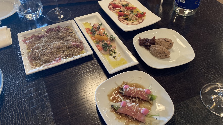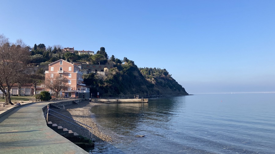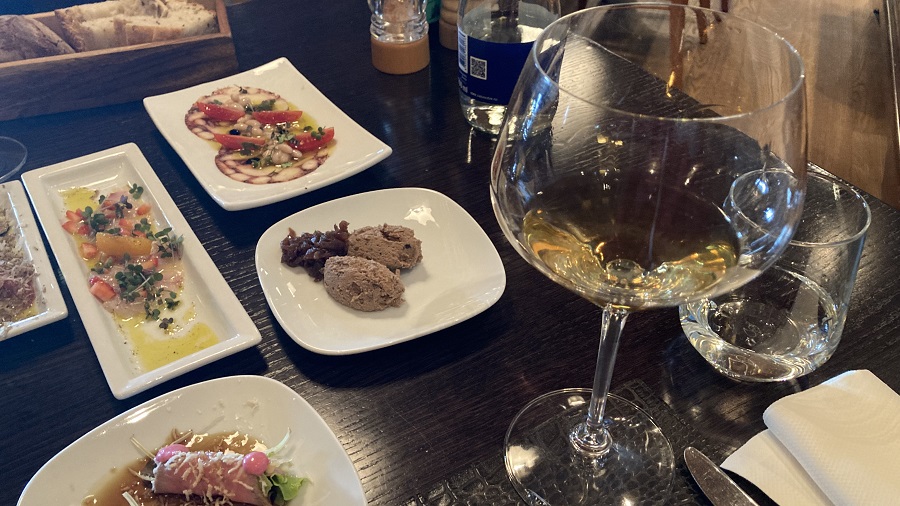 Zimski meseci so po najinem mnenju najbolj prijetni za obisk Obale. Ko nas v ljubljanski kotlini ovije megla, je najbolje pobegniti na sončno Obalo. Vedno parkirava v Strunjanu, nato pa skozi tunel v Portorož in ob obali do Pirana, nato pa naprej do Fiese in skozi gozd nazaj do Strunjana. Zelo lep krog z vmesnim postankom na sončku ob kavici v Piranu na Tartinijevem trgu. Običajno si potem privoščiva romba v pečici v domači gostilni Pod Trto v Strunjanu, tokrat pa sva se po dolgem času odločila za vrhunsko kosilo v Hiši Torkla. Izbrala sva seveda degustacijski 5-hodni menu in ob kosilu spila 3 kozarčke odličnega Sauvignona 2013 (Renčel). Začeli smo z različnimi hladnimi predjedmi – pašteta iz piščančjih jeter s čebulno marmelado, goveji carpaccio s črnimi tartufi, angleške rostbif rolice z jabolki, hrenom in rukolo, hobotnica s fižolom in paradižniki in brancinov carpaccio z jagodami. Sledil je izjemno okusen raviol, polnjen z rikoto in v carbonara omaki. Še eno lepo presenečenje dneva – zvitek s topinamburjem in jajčkom v omaki iz topinamburja in črnih tartufov, topinamburjev čips. Glavna jed je bila več kot izvrstna – z domačega žara suhozorjeni file in goveji file z zelenjavno prilogo. Nekaj sladkih grižljajev za vmes, na koncu pa še kostanjev mousse v kakijevi kremi. Kot sva že vajena – res odlično!