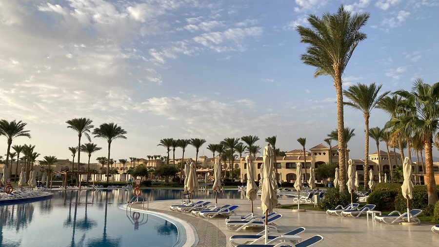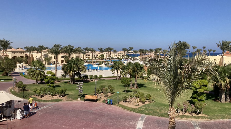 V Makadi zalivu sva bila nastanjena v prelepem 5-zvezdičnem resortu Cleopatra Luxury Resort Makadi Bay, kjer so naju lepo sprejeli. Kar naenkrat koronavirusa ni nikjer več. Vsi ves čas brez mask in popolnoma sproščeno vzdušje. Resort je zelo velik in je bil tudi dokaj poln. Prvi dve noči sva bila nastanjena v lepi sobi v prvi vrsti ob plaži, tako da sva imela res lep razgled. Soba je bila velika in zelo lepo opremljena. Imela sva vse vključeno, tako da nama res ni nič manjkalo. Takoj sva šla na kosilo, ki je bilo samopostrežno z mnogimi jedmi. Kuhali so res odlično in za vsakega je bilo ob vsakem obroku več kot dovolj izbire. V ceni sva imela vključeno tudi vso pijačo – tudi alkoholne pijače.