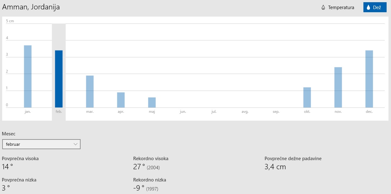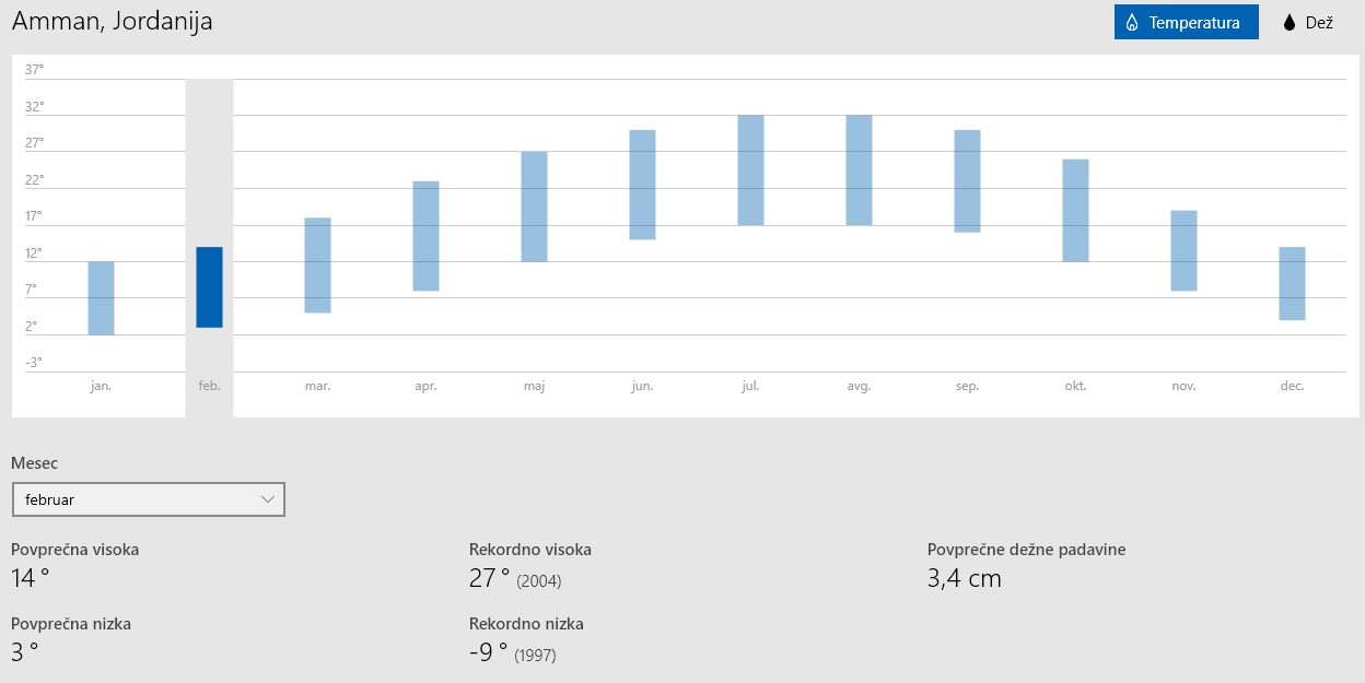 Potovanje v Jordanijo sem si vedno želela izvesti v bolj prijaznih mesecih za potovanje – april, maj, oktober, november. A se je pokazala drugačna priložnost in sva jo izkoristila ter tako potovala v “neprijaznem” decembru. Pa sploh ni bil tako neprijazen kot se zdi na prvi pogled. Ker sva se za potovanje odločila pičle 3 dni pred odhodom, sem lahko preverila že vreme za naslednjih 10 dni. In napovedano je bilo sončno in zelo lepo vreme, kar mi je dalo še več poguma za izvedbo potovanja. Zavedala sva se zelo nizkih temperatur ponoči in tudi tu in tam podnevi, zato sva s seboj vzela zelo topla zimska oblačila. V resnici sva potrebovala vse, od kratkih rokavov pa do puhovke, kape in zimskih rokavic. Slednje seveda veliko bolj kot prvo. Temperature so se gibale od neprijazne ničle pa nekje tudi do 20 st. Celzija. Sicer pa sva imela zelo lepo vreme, sončno in krasno za ta letni čas. Zadnji dan je res močno deževalo na poti iz Wadi Ruma do Ammana, ampak ker sva bila v avtomobilu in samo vozila naju to sploh ni motilo. Zavedati se morate še nečesa. Če potujete v teh zimskih mesecih, potem je dan res kratek. Zdani se okrog sedme ure in znoči ob štirih, zato morate previdno tempirati vse oglede, saj se znamenitosti zaprejo in nimate prav dosti izbire na prostem za oglede. Po najinem mnenju je potovanje konec decembra bilo super, ker je bilo manj obiskovalcev.