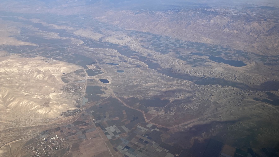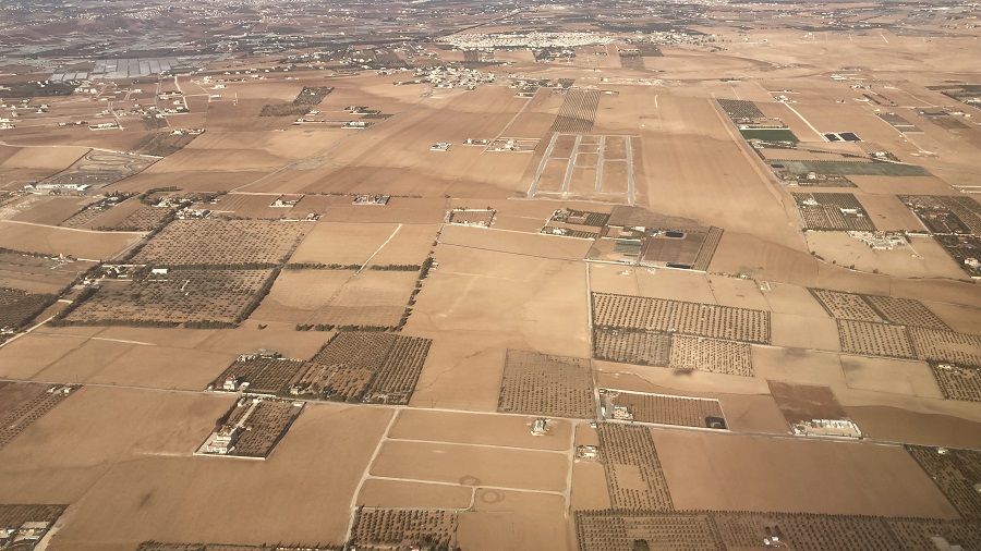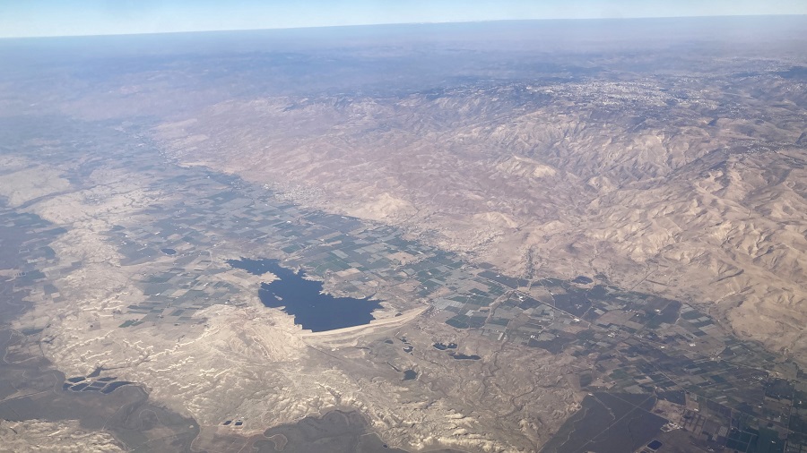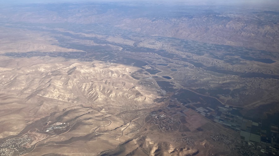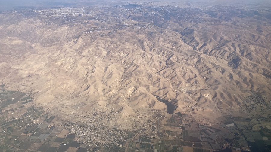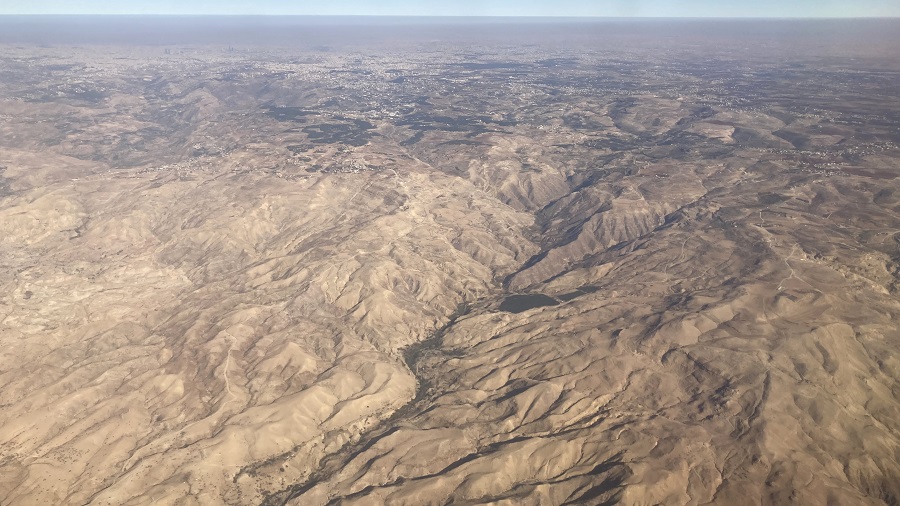Med letom sva lahko opazovala Jordanijo iz zraka, saj smo leteli podnevi. Prispeli smo z morja, zato sva lahko lepo videla hribovito pokrajino in reko Jordan ter njeno strugo, ki jo uporabljajo za kmetijske namene. Celotno porečje je več ali manj tudi edina obdelovalna površina za celo državo, zato izkoristijo vsak košček rodovitne zemlje. Zemljo je seveda treba namakati, zato poteka velik boj za vsako kapljo reke Jordan s sosednjim Izraelom. Vzhodni breg je Jordanija, zahodni breg pa Izrael. Namakanje in plenjenje vode je celo tako intenzivno v zgornjem delu, da praktično do Mrtvega morja ne priteče nič več vode. Hkrati sva videla kanjone in hribovito pokrajino ter mesta, ki ležijo visoko nad kanjoni. Vse to sva kasneje tudi prevozila. Bogati prebivalci pa si lahko ob svojih vilah celo privoščijo oljke oziroma gojijo sadje, medtem ko revnejši sloj živi v precej revnih nastanitvah.
