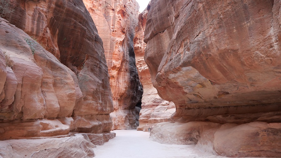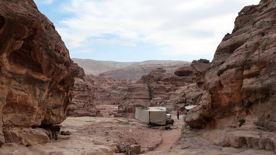 Po odličnem spancu sva si najprej privoščila okusen zajtrk, nato pa ponovno po ozki soteski do Zakladnice. Hotel sva imela pred vhodom, zato nisva izgubljala časa z vožnjo ali parkiranjem. Že vnaprej sva si kupila pri Jordan Passu 2-dnevno vstopnico za Petro, ki sva jo seveda potrebovala. Pazite – pri vstopnici za nočno Petro potrebujete tudi dnevno vstopnico. Pot nama je bila že precej poznana, saj sva jo včeraj prehodila kar dvakrat. Dolga je 2,5 km in za njo potrebujete pol ure zmerne hoje. Proti vhodu se malce spušča, nazaj grede pa malenkost vzpenja. A nič hudega. Naj vas ne premamijo mnogi domačini, ki vam ponujajo osla ali konja za jezdenje.