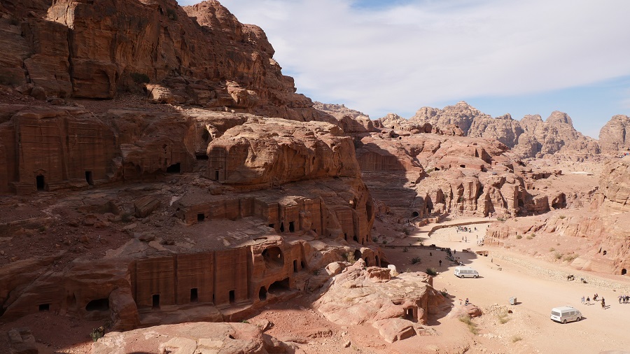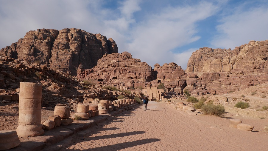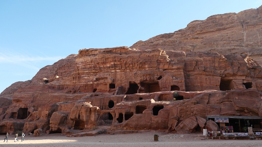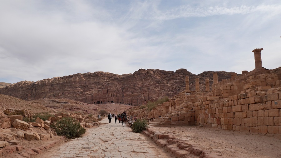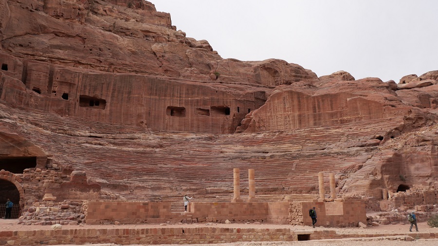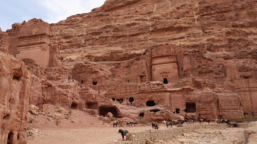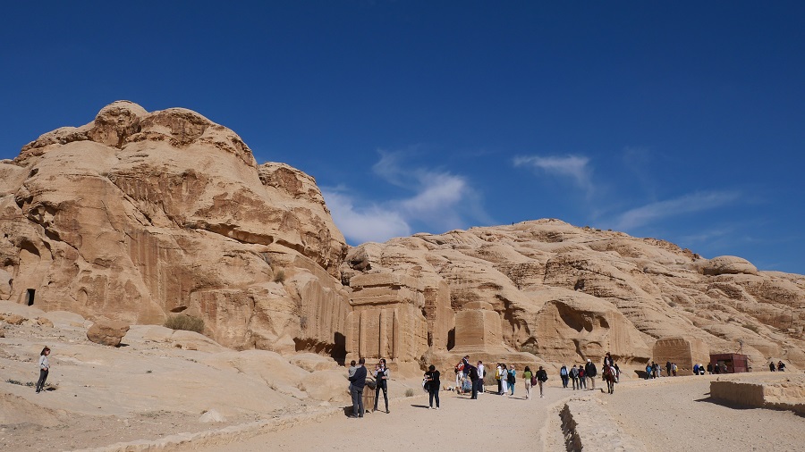 Po cesti se nato sprehodiva do gledališča, ko je še mesto zaspano. Odločiva se, da nadaljujeva do najbolj oddaljenega mesta v Petri. Seveda si sproti ogledujeva ohranjene znamenitosti. Najbolj naju pritegne pogled na grobnice, vse vklesane znake v peščenjak, množice osličkov v brezdelju, suha struga reke in prekrasne ogromne kraljeve grobnice, ki so prav tako vklesane v peščenjak.