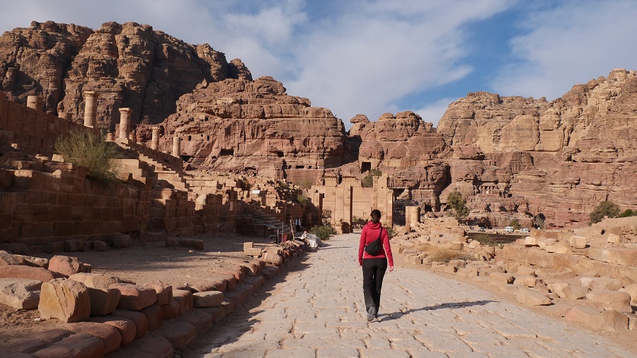 Že včeraj popoldne sva si pričarala izjemno lep pogled na Zakladnico v Petri in se kar dvakrat sprehodila po ozki soteski do nje, tako da sva jutranjo pot že dodobra poznala. Odličen zajtrk po dobro naspani noči v topli sobi naju je okrepil za celodnevno raziskovanje zgodovinskega mesta Petra. Ob 8h zjutraj sva se sprehodila po soteski (Siq) do Zakladnice, nato pa naprej v mesto do gledališča in po glavni cesti mimo grobnic naprej do začetka slovitih stopnic, ki vodijo do prečudovitega Samostana. Nazaj grede sva si ogledala še Veliki tempelj in se še enkrat podala visoko po nešteto stopnicah do razgledne točke “Altar of Sacrifice“, od koder je noro lep razgled na celotno mesto. Še sprehod mimo Zakladnice nazaj do hotela. Pred nama je bila še popoldanska vožnja v Wadi Rum, kjer sva se udobno namestila v razkošnem šotoru.