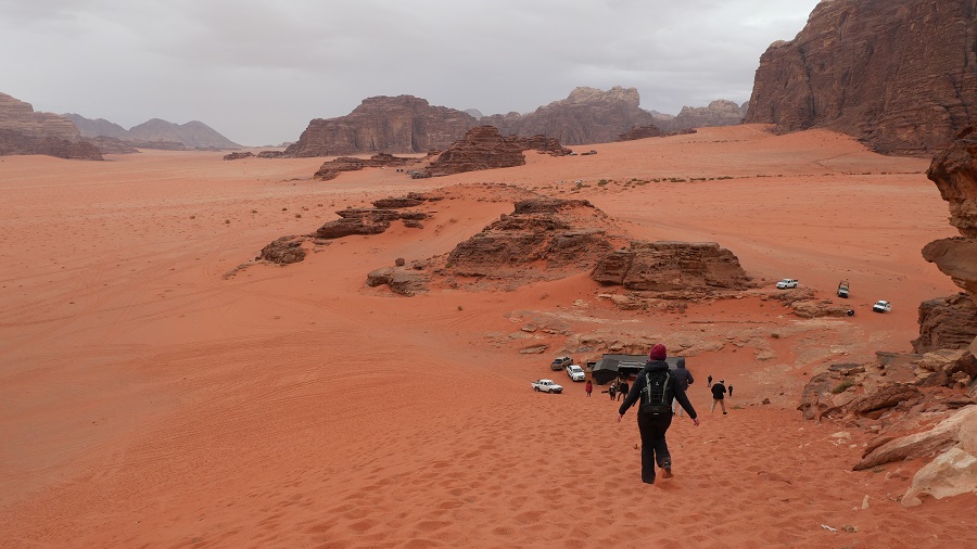 Za konec smo se ustavili še pri eni izmed lepih rdečih sipin. V Wadi Rumu jih ni prav veliko, a vseeno dovolj za nekaj neumnosti. Hoja po sipinah je izredno težka navzgor, navzdol pa otročje lahka in vedno super doživetje. Na vrhu sipine je bil lep razgled na zanimivo pokrajino.