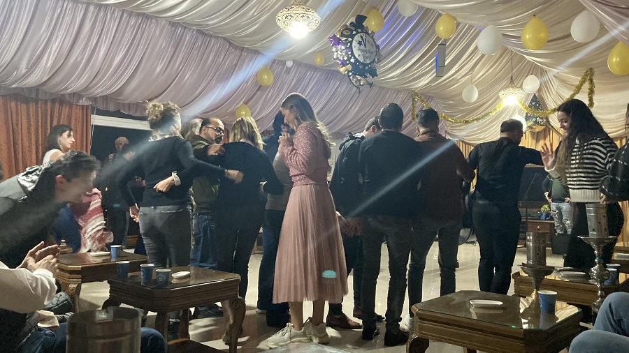 Res je bilo silvestrovo, ampak vseeno nisva pričakovala nič posebenega, saj ni bilo nobene posebne najave. Ponovno sva ob ognju srkala čaj z najinim prijateljem iz Egipta. Skuhali so nam izjemno silvestersko večerjo, ki je bila še za odtenek boljša kot običajno. Z veseljem sva pohvalila in pokramljala z glavnim kuharjem. Tako prijaznih in gostoljubnih ljudi že dolgo nisva srečala. Po večerji sva se odpravila do sobe in ob 22h slišiva glasno glasbo. Oblečem se kar čez pižamo in se odpraviva v šotor, kjer pa je bila prava silvesterska zabava. Lastnik kampa je priredil zabavo za svoje zaposlene, za voznike jeepov Beduine, za svojo ženo in hči, za svoje prijatelje. Turistov nas je bilo le peščica, ker je bil kamp vnaprej zaseden s prijatelji in zaposlenimi. Seveda smo bili še toliko bolj povabljeni in z veseljem sva se pridružila rajanju ob živi glasbi ter kajenju šiše. Nobenega alkohola. Niti v kampu, niti med domačini. Niti kapljice. Rajali smo dobri dve uri, skočili v leto 2022 in si voščili vse dobro. Kakšno presenečenje. Res hvaležna za to presenečenje in predvsem za pristnost, ki jo še redko doživiš na potovanjih.