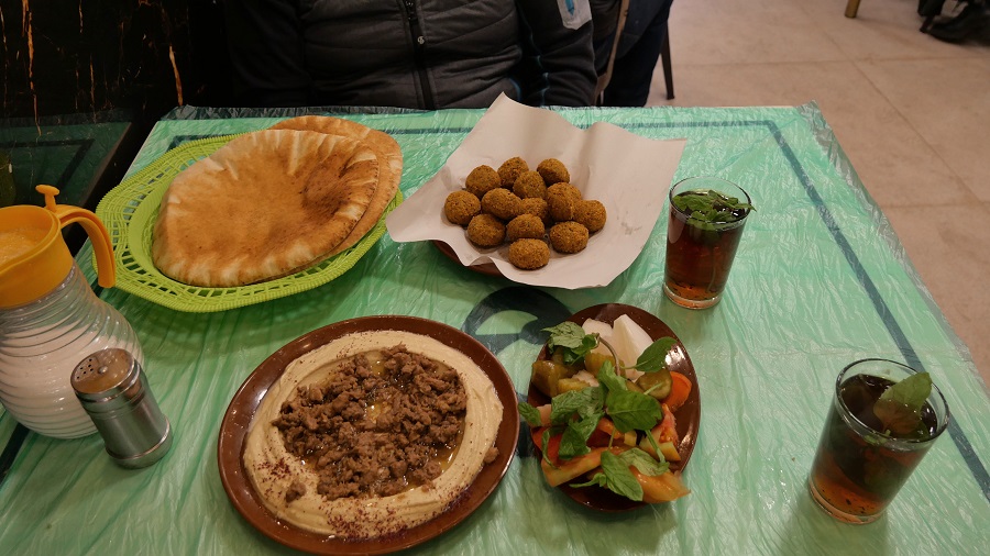 V Jordaniji zagotovo ne boste lačni, saj boste na vsakem koraku dobili več kot odlično hrano. Na vsakem boste dobili črn čaj s svežimi listi mete in veliko sladkorja ter turško kavo s kardamomom brez mleka. Zajtrki so bili izjemno okusni. Seveda pa so vedno vsebovali tudi humus z olivnim oljem in domače sire. Svežega sadja in zelenjave pridelajo skozi vse leto ogromno. Pozimi je največ granatnega jabolka in citrusov. Kosila so bila več kot odlična. Za začetek vedno humus in njihov domač kruh pečen v krušni peči. Včasih sva si tudi naročila meze, ki ga sestavlja več hladnih zelenjavnih predjedi. Odličen je tudi falafel, ki ga dobiš na vsakem koraku. Pri glavnih jeden sva si midva bolj izbirala jedi s piščancem, seveda pa dobite tudi izjemno okusno ovčetino. Sladkala sva se s sezamovimi piškoti in okusnimi baklavami. Za hrano sva na celotnem potovanju odštela 293 EUR oz. 16 EUR/dan na osebo. V Jordaniji se da seveda jesti veliko ceneje, a midva pri hrani res nikoli ne gledava na cene. Pa dober tek!