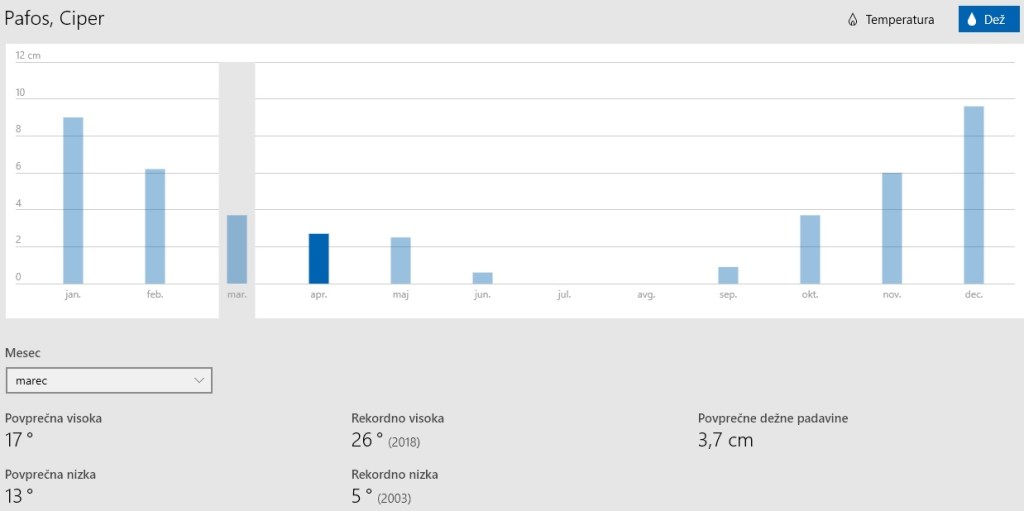 Ciper velja za destinacijo, ki jo je vredno obiskati spomladi, poleti ali jeseni. Zima ni najbolj primeren čas, ker je vseeno mrzlo, čeprav se promovira kot dežela s 320+ dni sonca na leto. Midva bi si sicer po lastni presoji raje izbrala kakšen teden kasneje za potovanje na Ciper, a tokrat ni bilo druge izbire. Kljub vsemu sva bila zelo vesela, da sva potovala v tem času. Torej zadnji teden marca je bilo ob obali sončno vreme med 15 in 25 stopinjami, kar je na soncu pomenilo že kar vročino. Ob blagem vetru je vse skupaj izredno znosno, predvsem pa najbolj primerno za blago martinčkanje in sprehajanje sredi dneva po soncu brez slabe vesti. Seveda je aprila in maja še znosno in morje se še nekoliko ogreje, tako da si pogumno že lahko privoščijo kopanje. Sedaj je imelo morje le 16 stopinj, kar je za naju občutno premalo. Skoraj ves čas je tudi pihal veter. V hribih sva imela še debelo snežno odejo in sicer okrog pol metra. Domačini so še na veliko smučali. Najlepše pa je bilo cvetenje travniških rožic, sadnih dreves in grmičevja, zato se resnično izplača obiskati Ciper tudi v tem času. Nama je to več pomenilo kot kopanje v morju, zato sva izbrala ta termin za potovanje po Cipru. Dežja praktično nisva videla na celotnem potovanju, je pa bil en dan oblačen. Še ena dobra stran časovne izbire – turistov je bilo praktično za prešteti na prste dveh rok. Več potem seveda na južni obali, a še vedno tako malo, da je bilo res prekrasno.