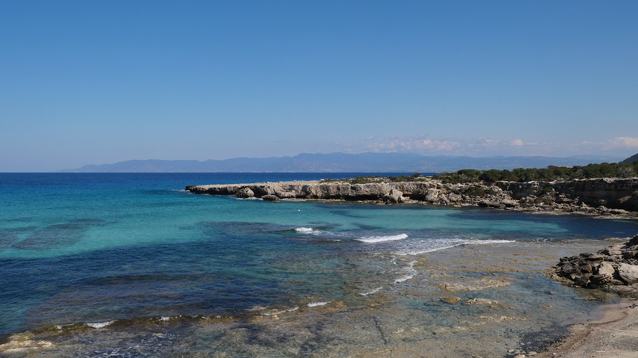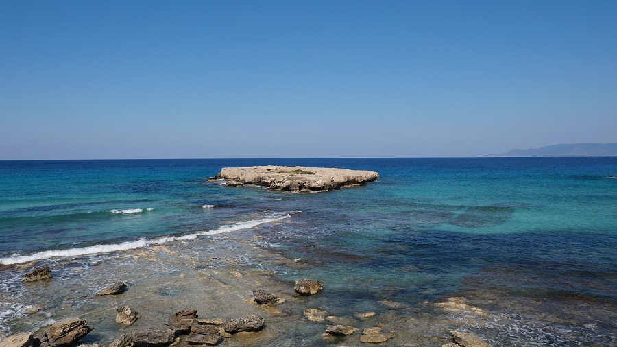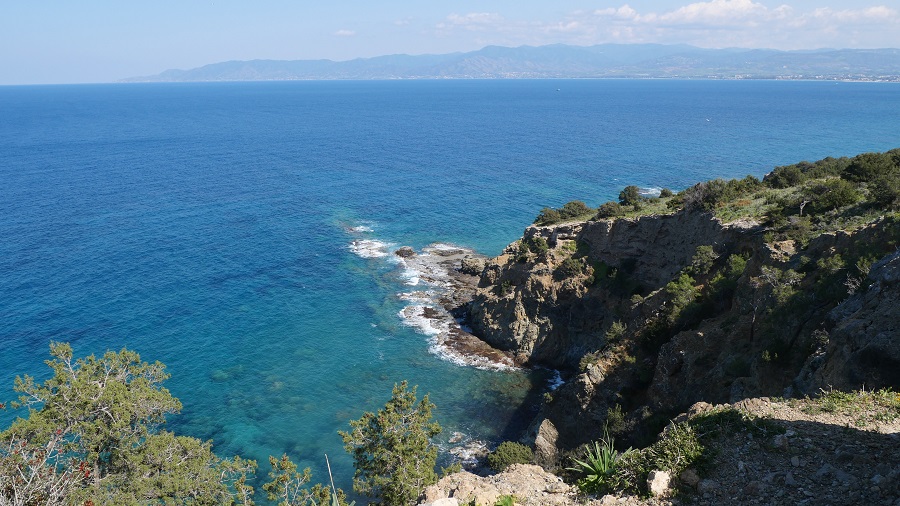 Celoten polotok Akamas je neposeljen nacionalni park, ki ima precej lepih pohodnih poti. Midva sva se odločila za pohodno pot ob morju in se imenuje Aphrodite Nature Trail. Začne se na označenem parkirišču in vodi vse ob obali do konca polotoka. Verjetno bi celotna pot nanesla kakšnih 20 km ali celo več v eno smer. Midva sva bila seveda za takšen podvig preutrujena in sva si privoščila dobrih 5 km v eno smer do Modre lagune (Blue Lagoon). Pot je zelo lepa, sončna, ves čas ob morju in tokrat z veliko cvetočimi rastlinami. Pot se tudi rahlo vzpenja in spušča, tako da boste naredili kakšnih 200 višinskih metrov. Ker sva hodila popoldne, sva bila praktično sama na celi poti. Le dvakrat so se mimo pripeljali hrumeči štirikolesniki, ki si jih lahko izposodite za raziskovanje polotoka na kolesih. Veliko bolj ekološka in primerna bi bila izposoja električnih koles. Žal tega še ni v ponudbi.