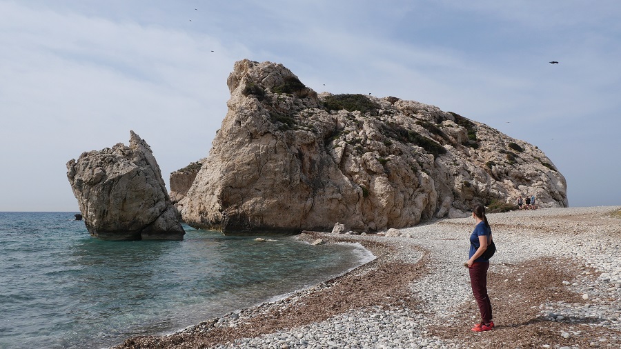 Po zajtrku sva se odpeljala proti Paphosu. Vmes sva naredila kratko postojanko pri znameniti turistični točki, ki se imenuje Petra tou Romiou oziroma Afroditina skala/plaža. Petra tou Romiou (“Rimska skala”) je morska skala ob plaži. Po eni od legend je ta skala kraj rojstva boginje Afrodite, morda zaradi penečih se voda okrog kamnin, zato je znana kot Afroditina skala.