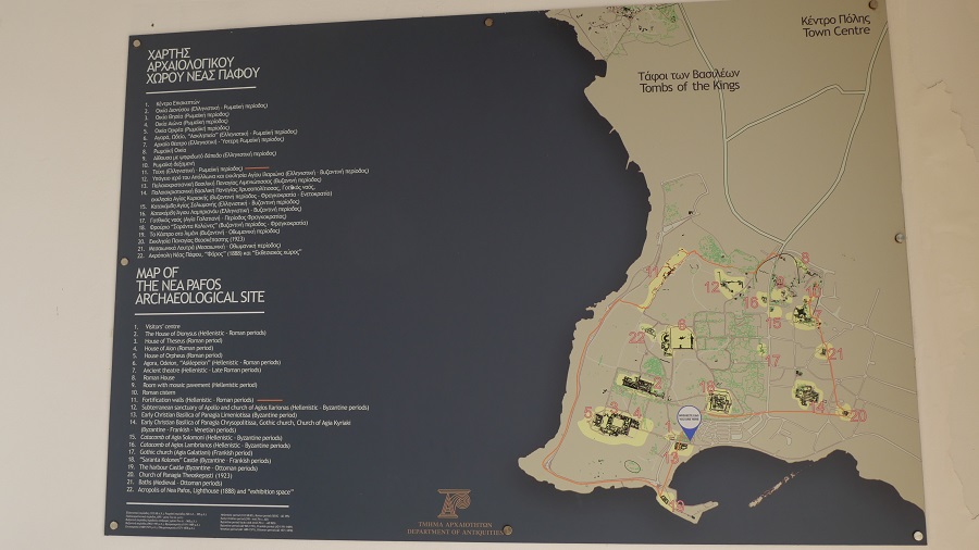 Dopoldne sva si ogledala še zelo zanimivo arheološko mesto v centru Paphosa. Arheološki park Kato Pafos zajema večji del pomembnega starogrškega in rimskega mesta, ki pa je še vedno v fazi izkopavanj. Najdišča in spomeniki izvirajo iz prazgodovine do srednjega veka. Med najpomembnejšimi do zdaj odkritimi ostanki so štiri velike in dovršene rimske vile: Dionizova hiša, Aionova hiša, Tezejeva hiša in Orfejeva hiša, vse z odlično ohranjenimi mozaičnimi tlemi, zlasti z Orfejevim mozaikom. Poleg tega so z izkopavanji odkrili agoro, asklipieion, baziliko, odeion in helenistično-rimsko gledališče ter nekropolo, znano kot “Grobnice kraljev”, ki si jih midva nisva ogledala. Nea Paphos je ena od treh delov, ki tvorijo arheološki kompleks Paphosa, in je bil leta 1980 vpisan na Unescov seznam svetovne dediščine, zaradi izjemnih mozaikov in starodavnih ostankov ter zgodovinskega verskega pomena. Zagotovo zelo zanimiv ogled na Cipru.