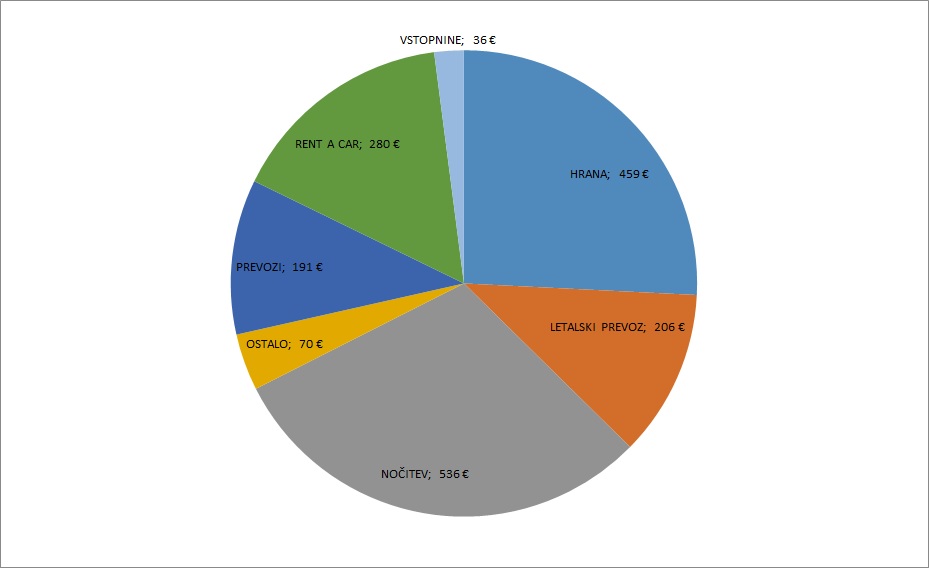 Na celotnem 8-dnevnem potovanju sva skupaj zapravila 1.785 EUR oziroma 893 EUR na osebo, od tega za 2 OSEBI:
