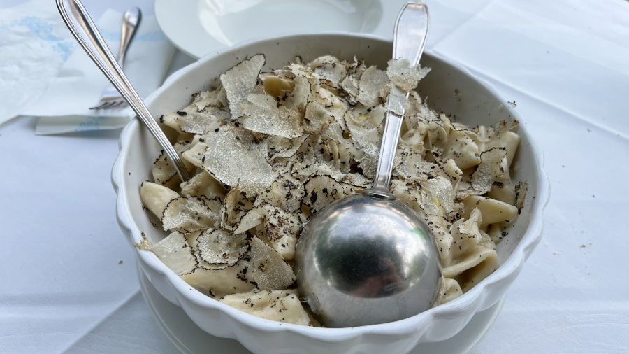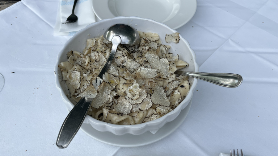 Do gostilne Belvedur sva prišla čisto po naklučju, ko sva doma iskala na Googlu nekaj za pod zob. Premamile so naju fotografije domačih fužov s tartufi, ki so jih vsi hvalili. Seveda je bil to tudi razlog, da sva se sploh potepala po teh koncih Slovenije. Za konec sva si pustila domačo gostilno in odlično kosilo. Nobene noblese, ampak pristna domača gostilna z lesenimi klopmi in belimi prti. Kaj nudijo? Ene in edine domače ročno izdelane fuže s tartufi. Brez filozofije. Drugega praktično tudi ni na jedilniku. Tja se pride na skledo fužev, ki so nepozabno okusni in porcija je gromozanska. S tartufi se tukaj niti slučajno ne “špara”. Za predjed si lahko izberete domačo popečeno skuto s tartufi ali domač narezek. Midva sva ostala pri prvi jedi in bila je odlična izbira. Poplaknila sva s kozarčkom Malvazije in več kot zadoljna odpeketala. Mamma mia – vrhunsko!