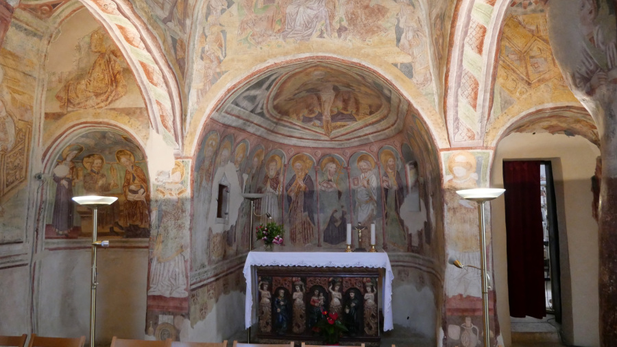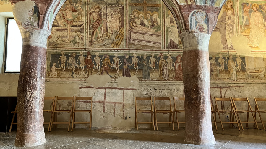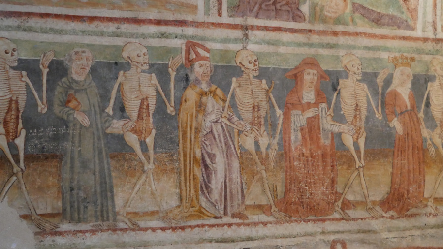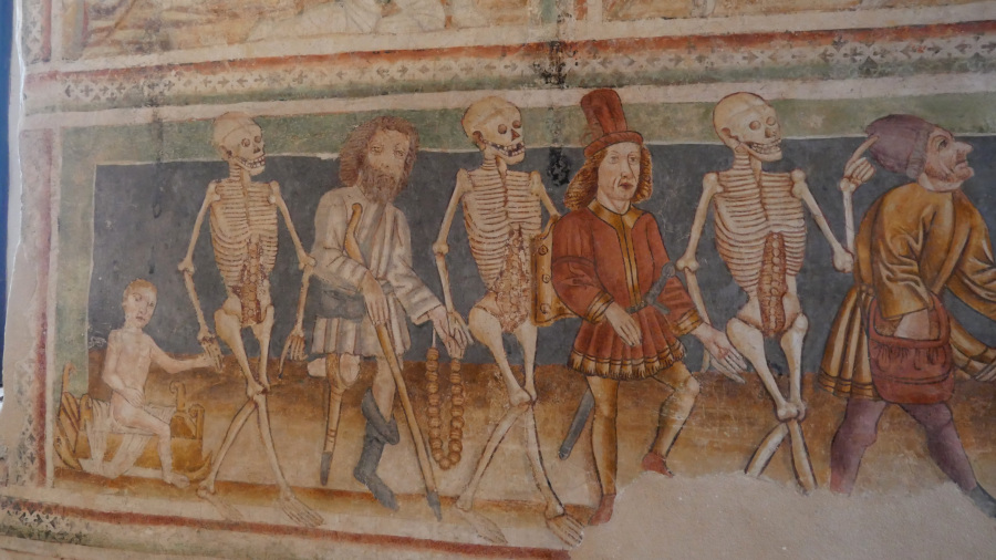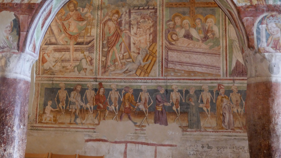 Cerkev je znana po poslikavah v notranjosti, saj krasijo popolnoma vse stene od roba do roba. Izjemno zanimive poslikave vam oskrbnik razloži skozi video posnetek. Najbolj znana freska je Mrtvaški ples, ki jo je naslikal Janez iz Kastva. Delo je bilo končano leta 1490. Freska, dolga sedem metrov, prikazuje sprevod, v katerem se proti pravkar izkopanemu grobu pomikajo predstavniki najrazličnejših slojev tedanje družbe in vseh starosti, od papeža, kralja in kraljice preko redovnika in meščana do berača in otroka, vsakič pa v paru s koščeno spremljevalko, ki ne pozna šale in ne jemlje podkupnine in pred katero so vsi ljudje enaki. Neizprosna je in vsem se enako reži v obraz. Vsi stopajo z njo proti istemu cilju, proti grobu, ki je njeno kraljestvo. Freska je najbrž nastala pod vtisom srednjeveških epidemij kuge.