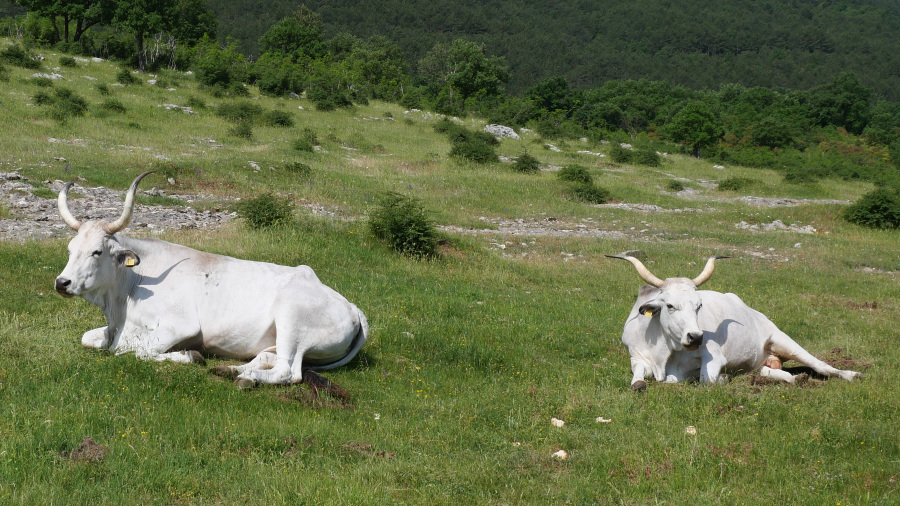 Med vožnjo sva na pašniku zagledala dva boškarina. Boškarin, znan tudi kot istrsko govedo, je avtohtona istrska dolgoroga pasma domačega goveda. Nikoli jih še nisva videla v živo, zato sva morala narediti kar krajši postanek. V Istri so bili boškarini včasih najbolj razširjena pasma. Volove, ki dosežejo težo od 1100 do 1300 kg, so uporabljali za oranje in jih vpregali v vozove. Istrsko govedo je pozno zrela pasma, saj odraste pri starosti 6 do 7 let. Boškarini imajo dolgo življenjsko dobo, saj se za delo in razmnoževanje lahko uporabljajo do 20 let. Odrasli voli imajo višino vihra okoli 150 cm. Značilno podobo jim dajejo veliki usločeni rogovi, ki so lahko dolgi do 1,50 m. Istrsko govedo je po naravi umirjeno, prijazno, vztrajno, ubogljivo, z malimi potrebami po krmi, kar je odraz večstoletne reje boškarinov kot delovne živali, ne pa za proizvodnjo mleka.