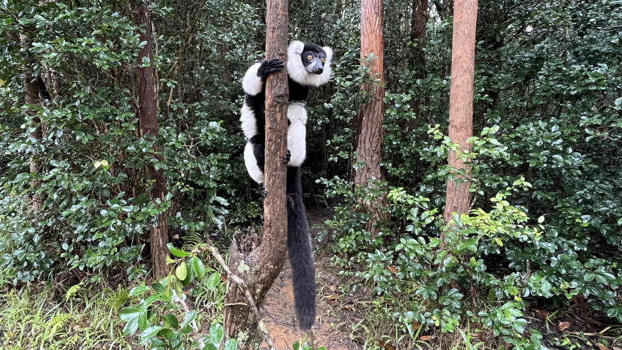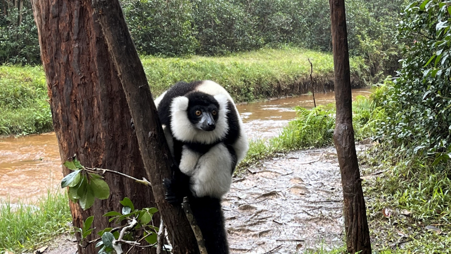 Kmalu po ogledu smo se začeli po cesti približevati deževnemu gozdu, kar pomeni seveda rahel dež. Cesta je postala še bolj nevarna in kamioni so imeli še več težav na cesti. Po dolgih kilometrih in nekaj urah smo prispeli v Andasibe, kjer so tudi temperature pošteno padle. Ob deževju ni bilo prav nobene vročine, ravno nasprotno. Odpeljali smo se do prekrasnega Vakona Forest Lodge na odlično kosilo. Pogreli in posušili smo se ob kaminu, kar je res več kot prijalo. Nisva se namreč ravno pripravila na tako mrzlo podnebje in se seboj nisva imela prav veliko toplih in nepremočljivih oblačil. Kosilo je bilo odlično, nato pa sva si na hitro še pogledala zasebni park z lemurji. Razigrani lemurji, deževalo je kot iz škafa, seveda po tleh blato do kolen. Zelo hitro sva naredila krog po parku, ker sva bila premočena in premražena do kosti.