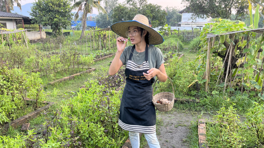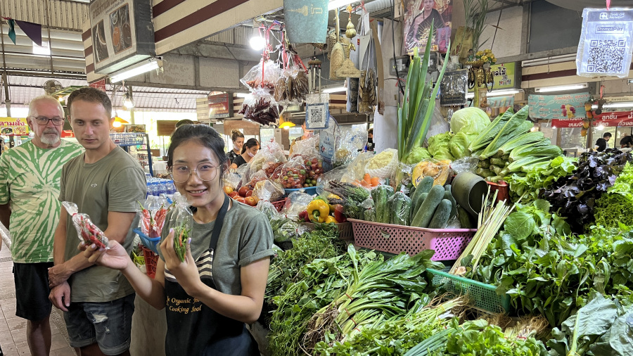 Ob obisku Tajske sva si zelo želela tudi na kuharski tečaj. To je zadnja leta kar obvezno, če si v Chiang Mai-ju. Ponudnikov je precej, jaz sem izbrala Smile Organic Farm Cooking School in karti kupila kar na Tripadvisorju dan vnaprej. V ceno tečaja je vštet tudi prevoz iz in do vašega hotela, kar je super. Pred tečajem nikar ne jejte, saj vse kar skuhate, tudi pojeste. In hrane je veliko preveč. Šla sva na popoldanski tečaj in trajal je od 15h do 21h. V hotelu so nas pobrali s kombijem malo pred tretjo popoldne. Najprej smo obiskali tržnico, kjer nas je kuharica Bibi poučila o zelenjavi in kuharskih začimbah. Tajcem (mogoče) zamerim le pakiranje hrane in pijače v 3 plastične vrečke, ampak ali je pri nas kaj drugače?! Enako, samo da mi gremo v supermarket.