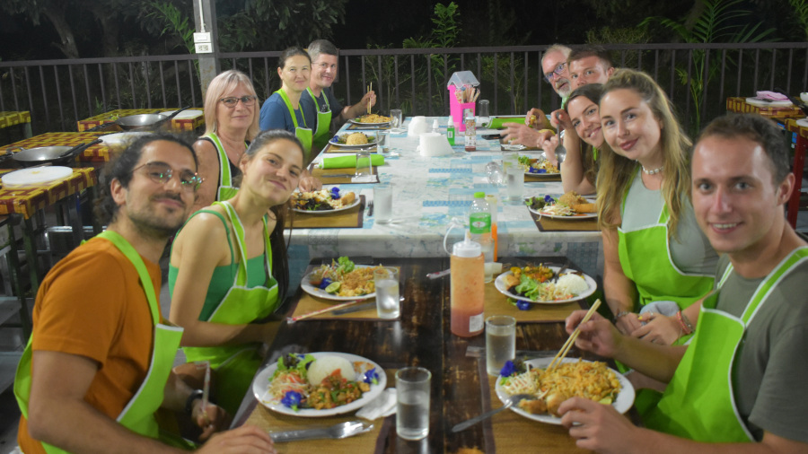 Sledilo je še kuhanje juhic in curry omak. Jaz sem si izbrala bolj nežne okuse, Matjaž pa je izbiral malo bolj pekoče. Nekateri v skupini pa so bili res izjemno pogumni in dodajali curry paste kot za šalo. Skuhali smo si odlične jedi in jih na koncu tudi z veseljem pojedli. Žal pa je bilo hrane na pretek, tako da nam je žal tudi ostajala. Po končani večerji smo se s kombijem peljali še dobro uro nazaj do mesta in do svojih hotelov. Na tečaju sva skuhala kar 7 različnih jedi in še curry paste. Super doživetje.
