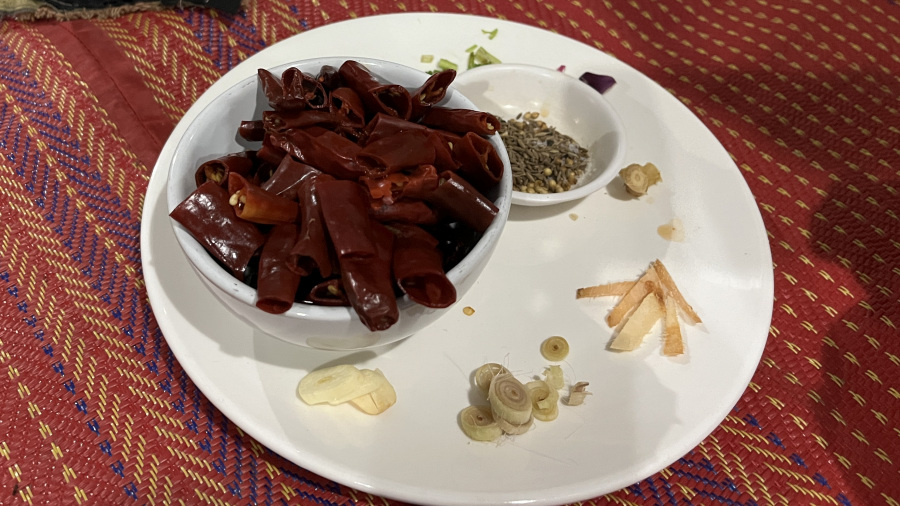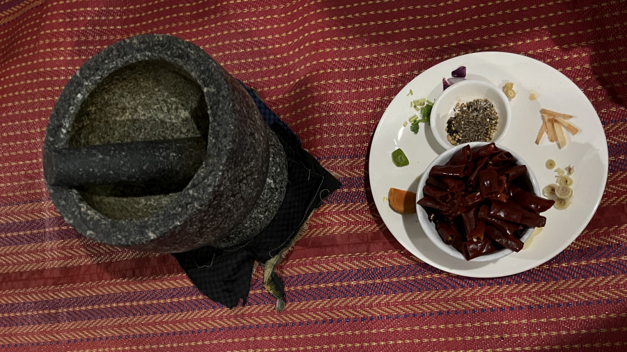 Za zadnji dve jedi smo potrebovali curry paste, zato smo si jih naredili povsem od začetka. Čiliji, začimbe, terilnik in veliko ročnega trenja. Pri tem smo se izmenjevali, ker je res težavno delo. Ampak smo uspeli in naredili odlične curry paste, ki smo jih nato uporabili pri kuhanju jedi.
