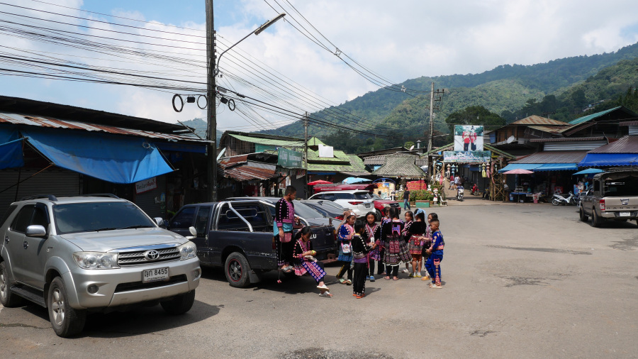 Na tajskem živi tudi zelo veliko plemen, predvsem tukaj na severu. S skuterjem sva se od templja peljala še naprej, cesta je postajala veliko ožja, a še vedno asfaltirana. Še vedno sva se dvigala in potem celo zelo spustila v majhno ter odročno vas Doi Pui. V vasi domuje samo 500 prebivalcev plemena Hmong. Na edinem parkirišču sva zagledala skupino otrok, ki so prišli s šolo v tradicionalnih oblačilih iz še bolj odročnih vasi do vasi Doi Pui. Uau, kako sem bila vesela. Otroci so bili veseli in razigrani. Po edini ulici v vasi se vijejo prodajalne oblačil, prigrizkov, vina in čajev. Kitajska je čisto blizu. Mobilni telefoni so tudi tukaj v prvem planu in otroci so tudi tukaj zatopljeni v njihove ekrane. Žalostni prizori. V vasi je tudi čisto majhen muzej plemen, ki sva si ga ogledala. Srečala sva le nekaj izgubljenih turistov.