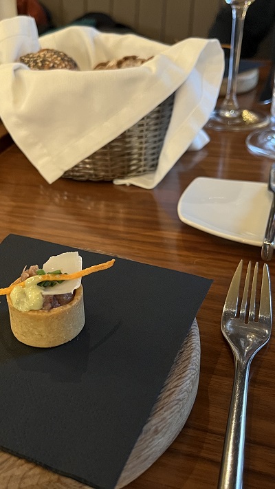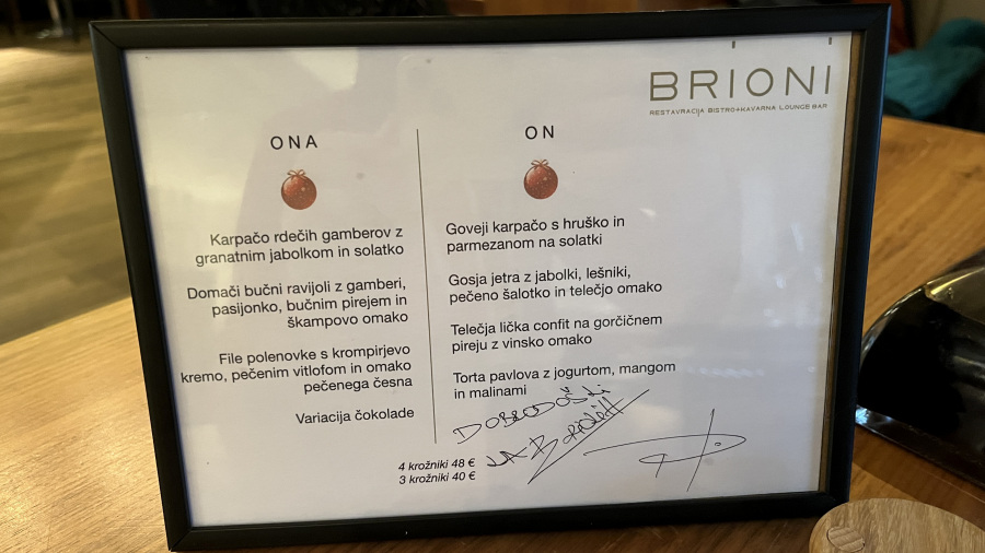 December je vedno čas za praznovanja. Tokrat sva se ob osebnem praznovanju odločila za nama ljubo Restavracijo Brioni v Kranju, ki jo večkrat obiščeva. Običajno za malico ali kosilo med tednom, večkrat tudi za sobotno kosilo. Ob koncu leta pa si vedno privoščiva tudi njihov decembrski degustacijski menu, ki ga poimenujejo ONA ali ON. Odločila sva se za ON, ki je mesni menu. Aperitiv višnja v “sexy” kozarčku za štart, nato pa izjemen pozdrav iz kuhinje. Sledili sta dve vrsti masla in domače pečene bombetke. Potem pa zares. Izjemen goveji karpačo s hruško. Sledila so gosja jetra z jabolki in telečjo omakco. Glavna jed je bila izvrstna – telečja lička za razvajanje brbončič na gorčičnem pireju. Njihovo torto pavlovo pa že dobro poznava in je izjemno okusna. Za konec samo še dva čokoladna tartufa, ki sta naju dokončno osrečila. Popolno praznično kosilo.